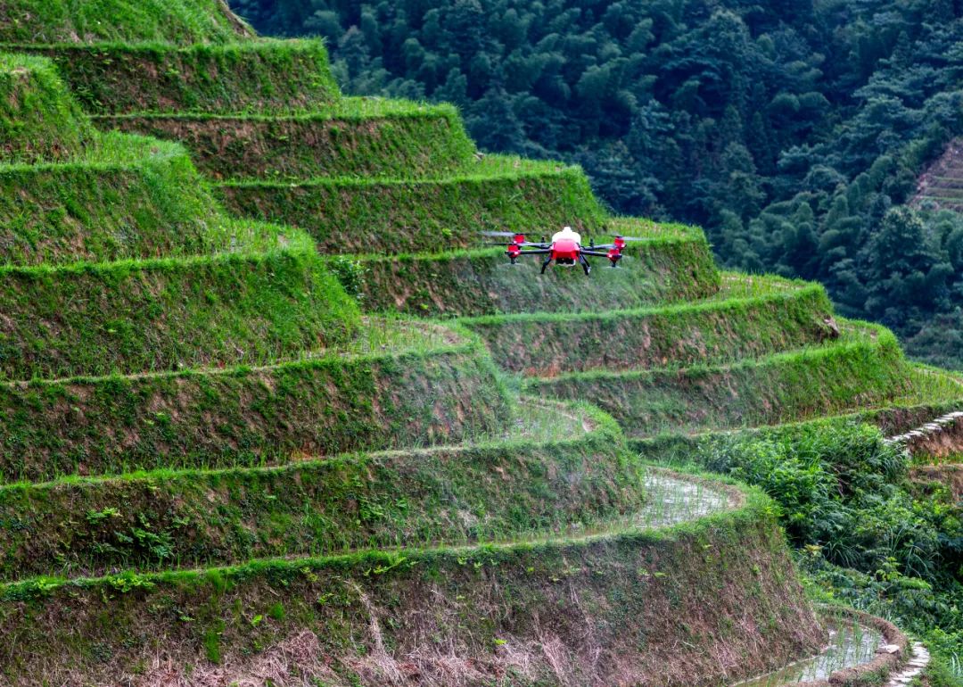 梯田自动化生产一直都是世界性难题。极飞是如何帮助提升梯田的自动化生产效率呢?在遥感无人机对梯田进行测绘建模,获取高清三维地图后,极飞农业无人机通过 RTK 高精度导航技术与变量喷洒技术,顺利实现了梯田自动化播种和植保,提高了梯田生产效率。