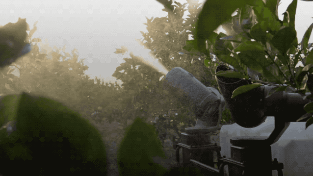 搭载气流喷射雾炮,极飞农业机器人就是最强的地面植保机,可将药液从下往上强力穿透树叶;
