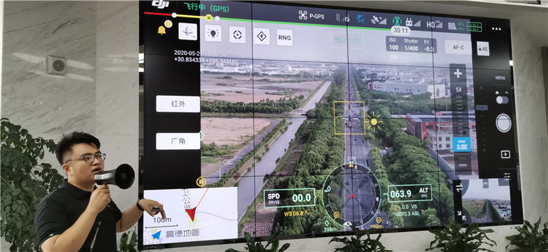在推介会结束前,主办方上海到摄与大疆工程师在基地做了现场展示,通过电子大屏演示了无人机飞行及最新挂载的应用。智能跟踪功能是经纬 M300 RTK 与禅思 H20系列组合下的一大重要亮点,在面对人、车等移动目标时,无人机可实现自主识别、定位并持续跟踪,借助强大的变焦功能,将目标始终锁定在画面中心。因此,即使面对近1000米外的高速移动车辆,也能够看清车牌。这在野外追捕、交通执法等公共安全应用场景中,能够帮助警务人员高效完成追踪和执法记录,提升警务效率。