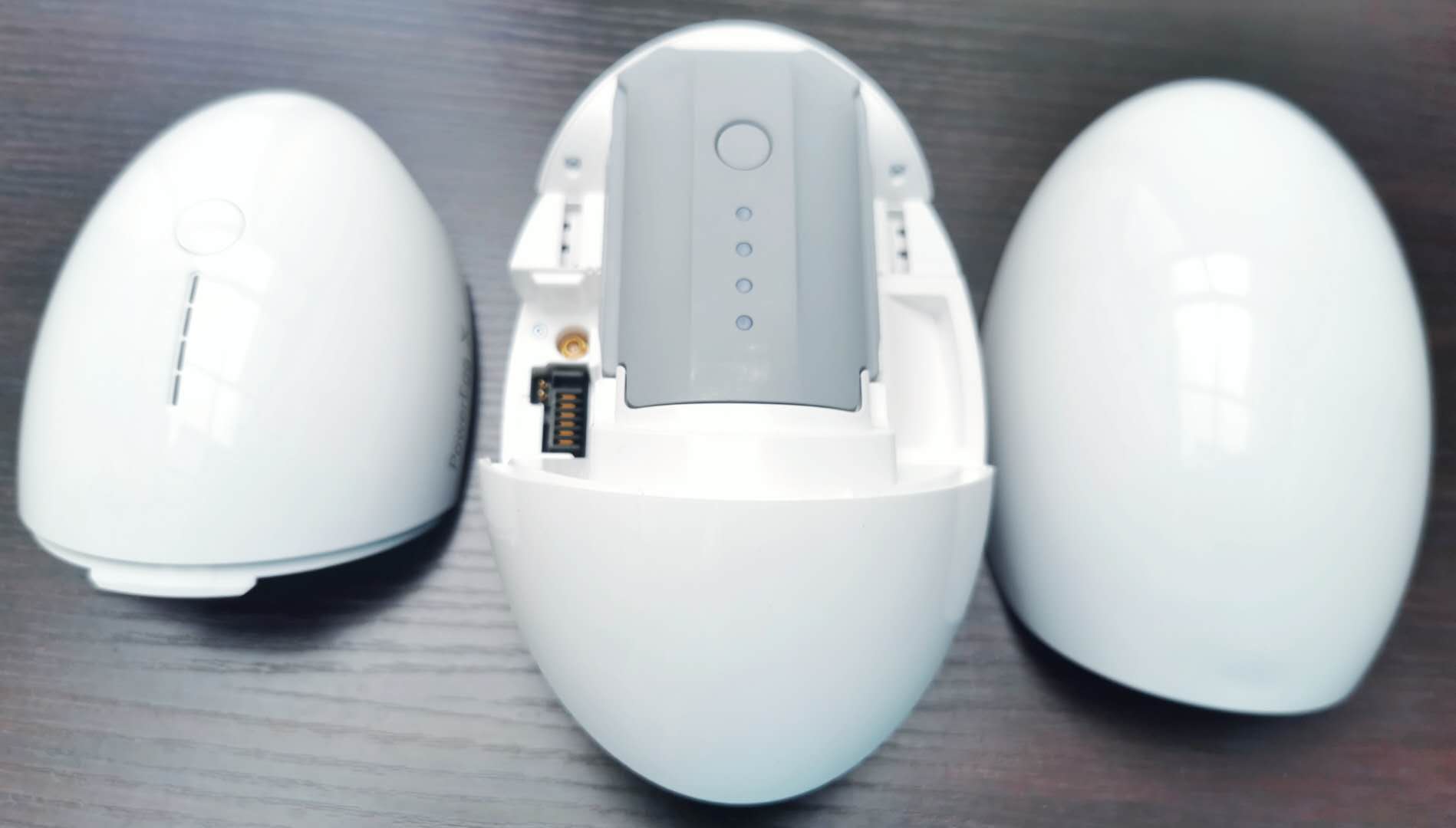 “小巨蛋”作为产品的主角我们必须得好好的了解一番。打开蛋壳(顶部和底部均能打开),顶部暴露出的是电池、机臂卡槽和手持卡槽,若是取下电池,则可以看到底部有一个TF卡的插槽,可支持最大128GB容量。蛋的中央位置是电池仓的位置,其搭载了一块3800mAh的电池,在飞行模式下,续航可以达到25-30分钟。