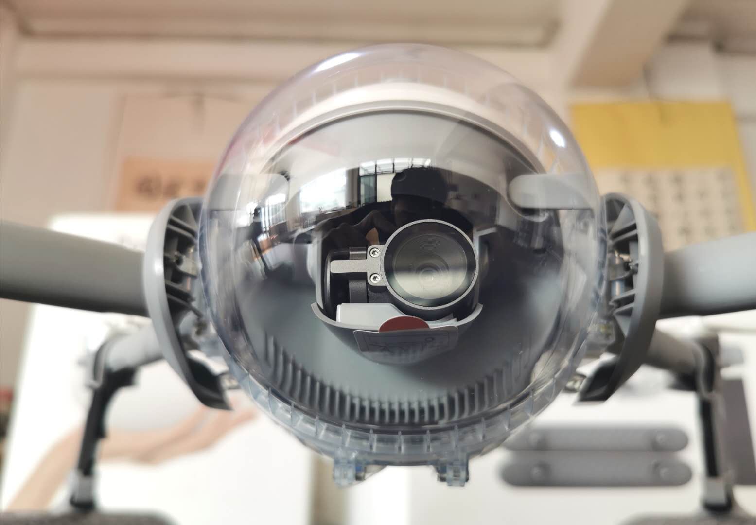 “小巨蛋”底部配件属于其核心部件之一,可以说整个设备应用都是围绕着摄像头而展开。摄像头采用了一颗1/2.8英寸的CMOS,并拥有F1.8的大光圈,最大可拍摄分辨率为4000*3000px的静态图片,并最高支持4K 60FPS的视频拍摄。经过后面实测拍摄效果和画面还是非常清晰,满足当下直播和航拍的需求。在一体式云台摄像头上方为前视觉系统,该系统不但在飞行模式下,可以让臻迪PowerEgg X拥有避障等能力,在摄像机模式下,也可以通过其完成一系列AI拍摄功能。