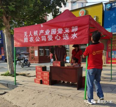 7月7日清晨一大早,无人机产业园党支部、酷农无人机的工作人员就早早地赶到了西华县第三高级中学考点前,他们支起帐篷,把几百件爱心用水一箱箱地搬下车。三十多度高温下,汗水把工作人员的红色工作服打湿了,所有的祝福通过一瓶瓶水在传递。