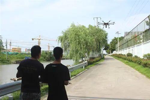 一架无人机腾空而起,缓缓飞过河道上空