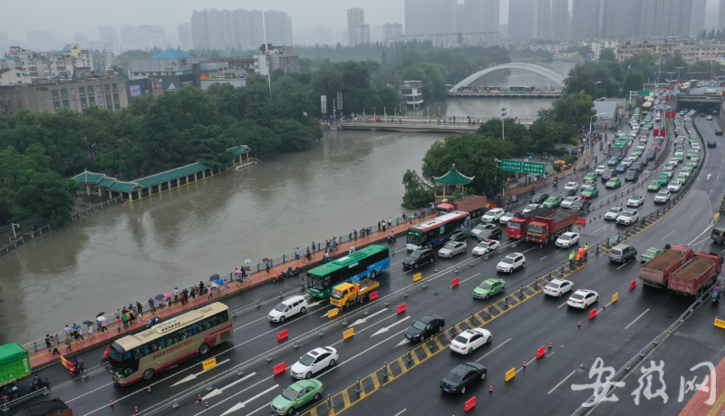 合肥市相关部门紧急调用载满砂石的重型货车对桥面进行压重,通过采取“重车压桥”的方式增强桥梁自重,提高洪峰对桥墩冲刷时的梁体稳定性。