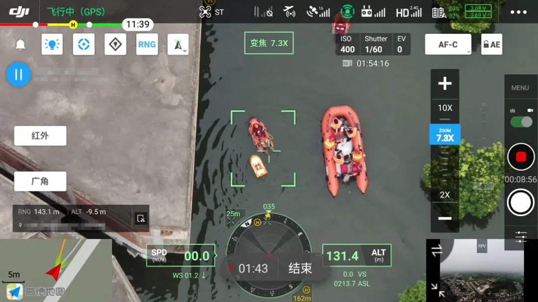 除了双控接力,无人机也与地面舟艇充分联动。一旦发现异常状况或呼救人员,无人机救援团队立即通过无人机搭载的激光测距模块,定位被困人员,并将精准坐标点传输给地面团队。
