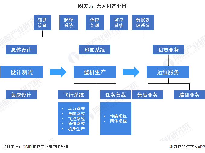 首先,先从无人机产业链布局方面来看。无人机产业链可分为上游设计测试、中游整机生产以及下游运维服务三个主要环节,每个环节各有细分侧重点。