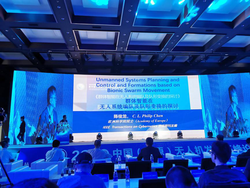 欧洲科学院院士、华南理工大学教授陈俊龙作题为《群体智能在无人系统编队及队形变换的探讨》演讲,他阐述有人飞机到无人机的历史,以专业角度向参会嘉宾分析群体智能的无限可能性,他认为,无人机智能集群技术是未来超级大国争夺无人机技术的一个巅峰。