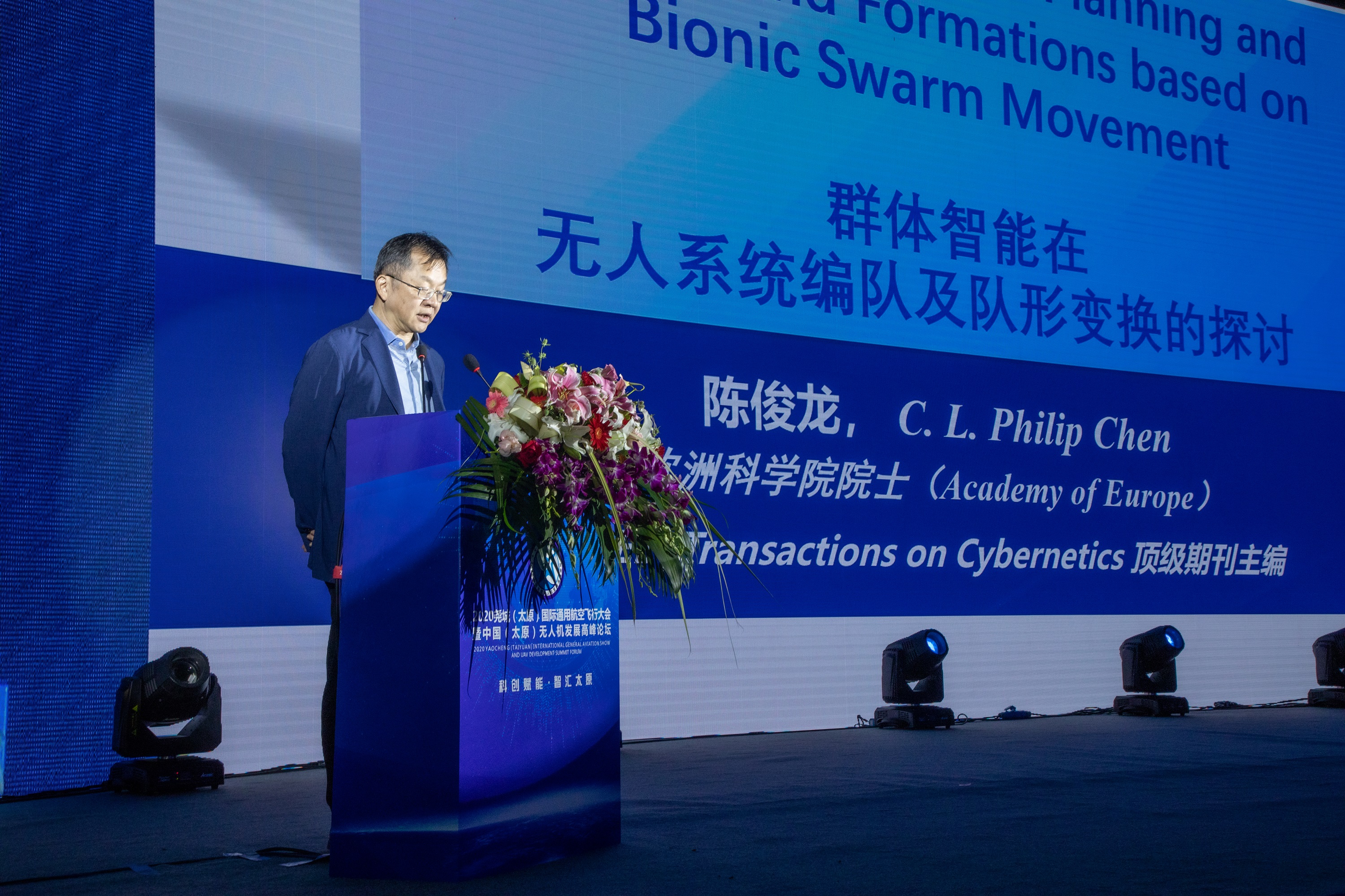 欧洲科学院陈俊龙院士作了题为《群体智能在无人系统编队及队形变换的探讨》报告,从专业角度分析了群体智能的无限可能性,认为,无人机智能集群是未来的一个技术风口。
