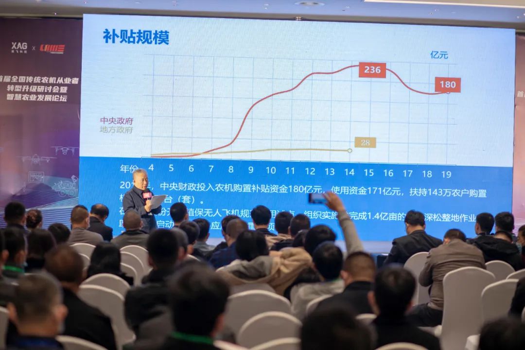 论坛上,中国农业机械化协会副会长杨林分享了近两年来我国农机化的发展情况:我国主要农作物综合机械化率超过 70%,小麦、水稻、玉米三大粮食作物耕种收综合机械化均已超过 80%。但是管理环节机械化水平仍相对滞后,以农业无人机为代表的无人化智能农机的兴起,快速填补了我国农业生产管理环节机械化水平低下的空缺。传统农机行业发展已经饱和,整体开始呈现下滑趋势,以无人化、自动化为代表的智能农机开始成为未来农机发展的主要方向,国家也将会加大财政补贴力度。”