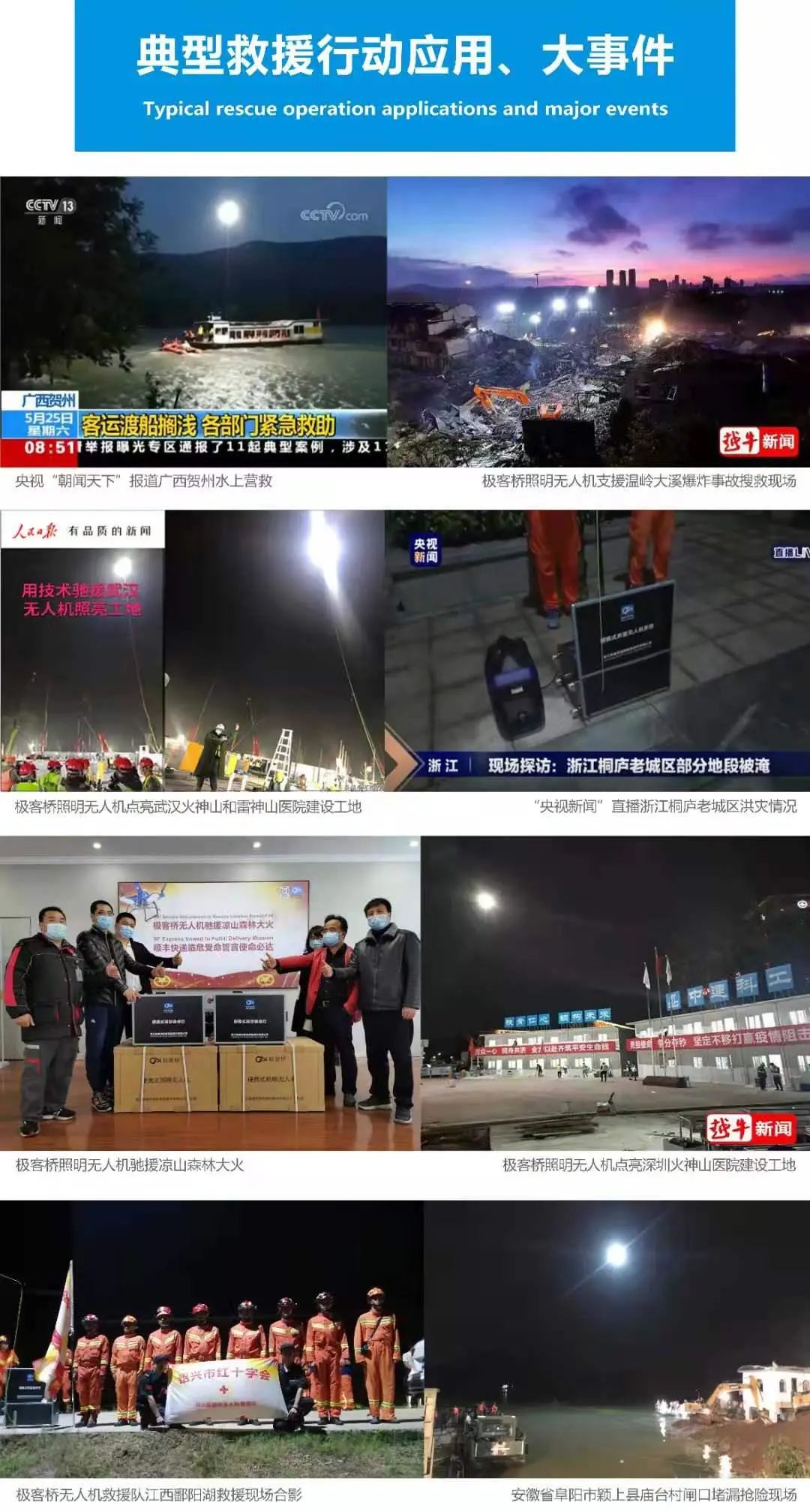 极客桥系留照明无人机在这两年行业应急救援中“大放光彩”,经常出现在夜间重大的应急救援和施工现场,为现场工作人员提供光明。比如说,在今年极客桥系留照明无人机不仅在疫情期间为武汉火神山和雷神山的施工提供夜间照明,而且在今年全国多地抗洪抢险的支援中提供夜间应急照明救援。