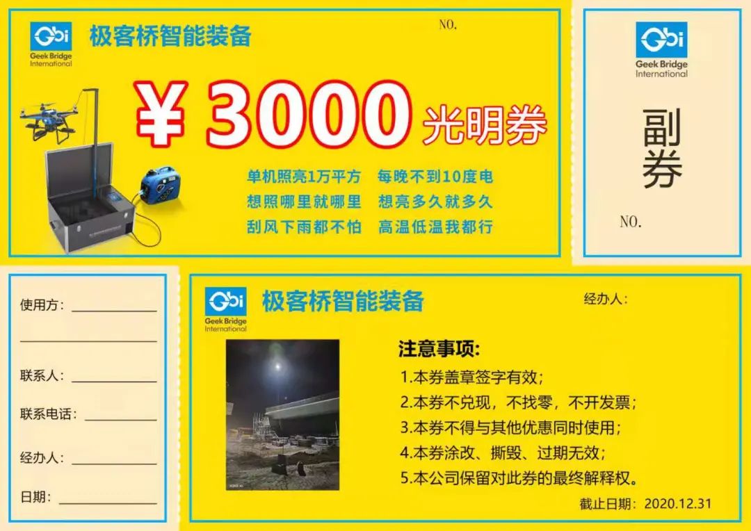 区别与普通的航拍无人机,极客桥公司所租赁的产品是公司主打产品也是经过“战斗前线”摸爬滚打过的夜间系留照明无人机,这款无人机主要是用于夜间施工、抢险、应急等用户。其主要特点是具备在夜间野外复杂环境下应急救援和各类作业的照明设备应满足响应快捷、部署灵活,安全可靠、范围大、亮度高、环境适应强等要求。
