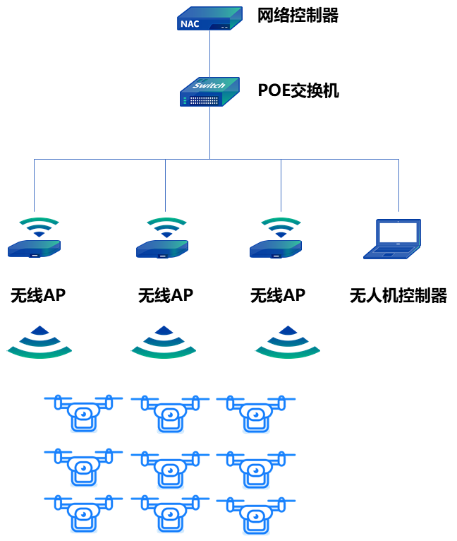为保障网络稳定,组网不联通互联网,直接由网络控制器下联POE交换机,与无线AP组成局域网,再将无人机控制器上联POE交换机,使整个局域网网络通讯可达。