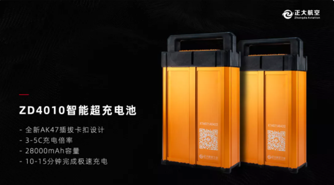 ZD4010智能超充电池,全新AK47K插拔卡扣设计全新智能电池保内一年无限次使用。搭载智能充电器,7200W充电功率,28,000mAh 10-15分钟完成极速充电。
