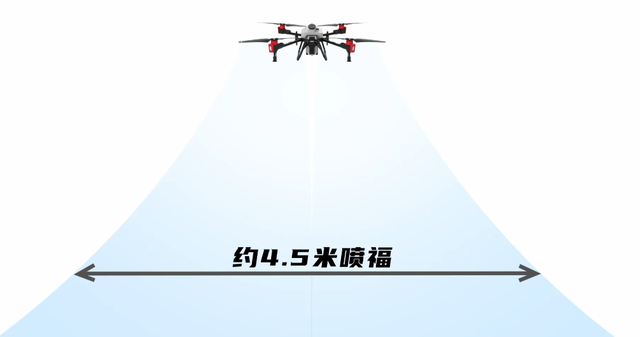 拿极飞 P 系列农业无人机举例,它的满载起飞重量是 46 公斤,飞在空中,四个螺旋桨大约产生了 46 公斤的向下气流,标准作业高度下,这股气流所能覆盖的有效面积约为 4.5 米乘以 4.5 米。因为是前后对称的四旋翼布局,后方两个螺旋桨大约产生了 23 公斤的气流,它承担了 XP 无人机的喷洒任务,精准喷幅约为 4.5 米。也就是说,XP 无人机在飞行作业中,对气流的利用率只有 50%。