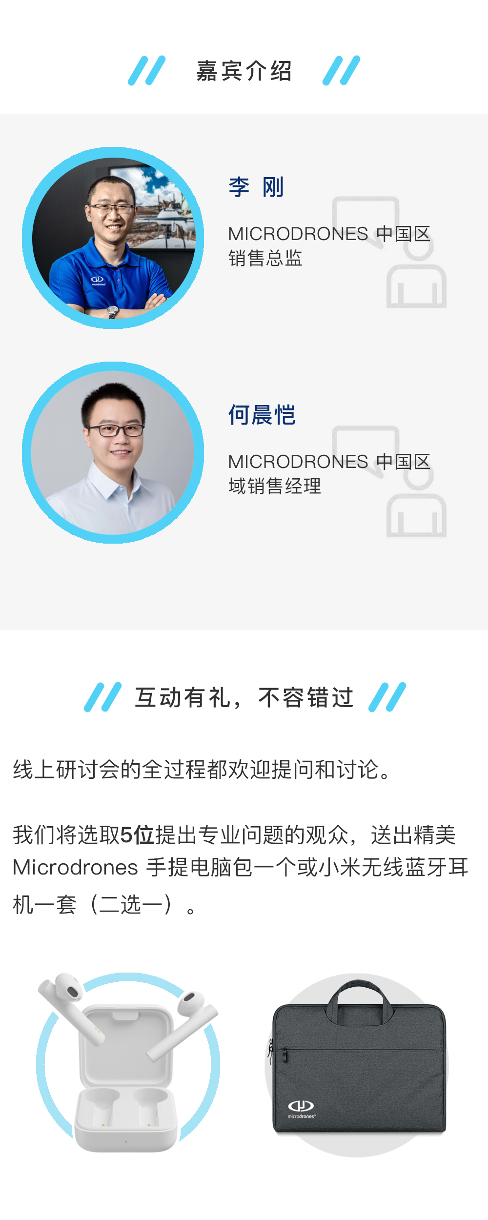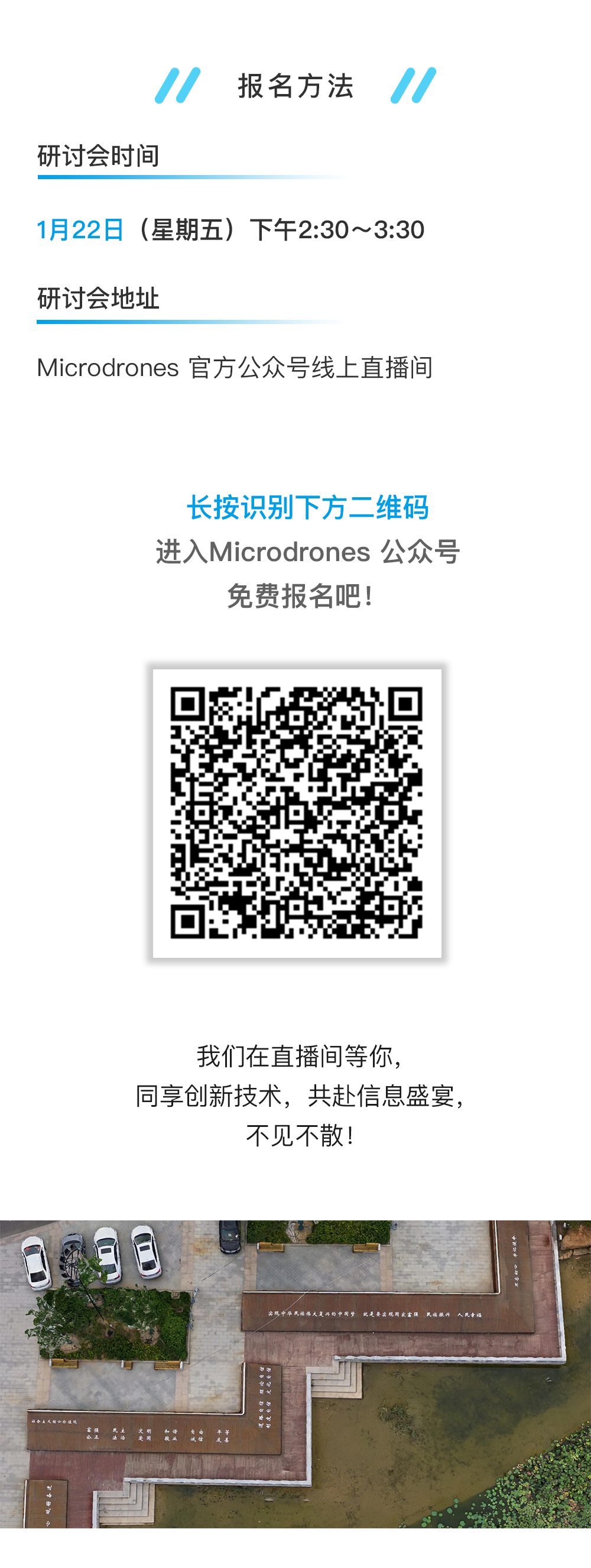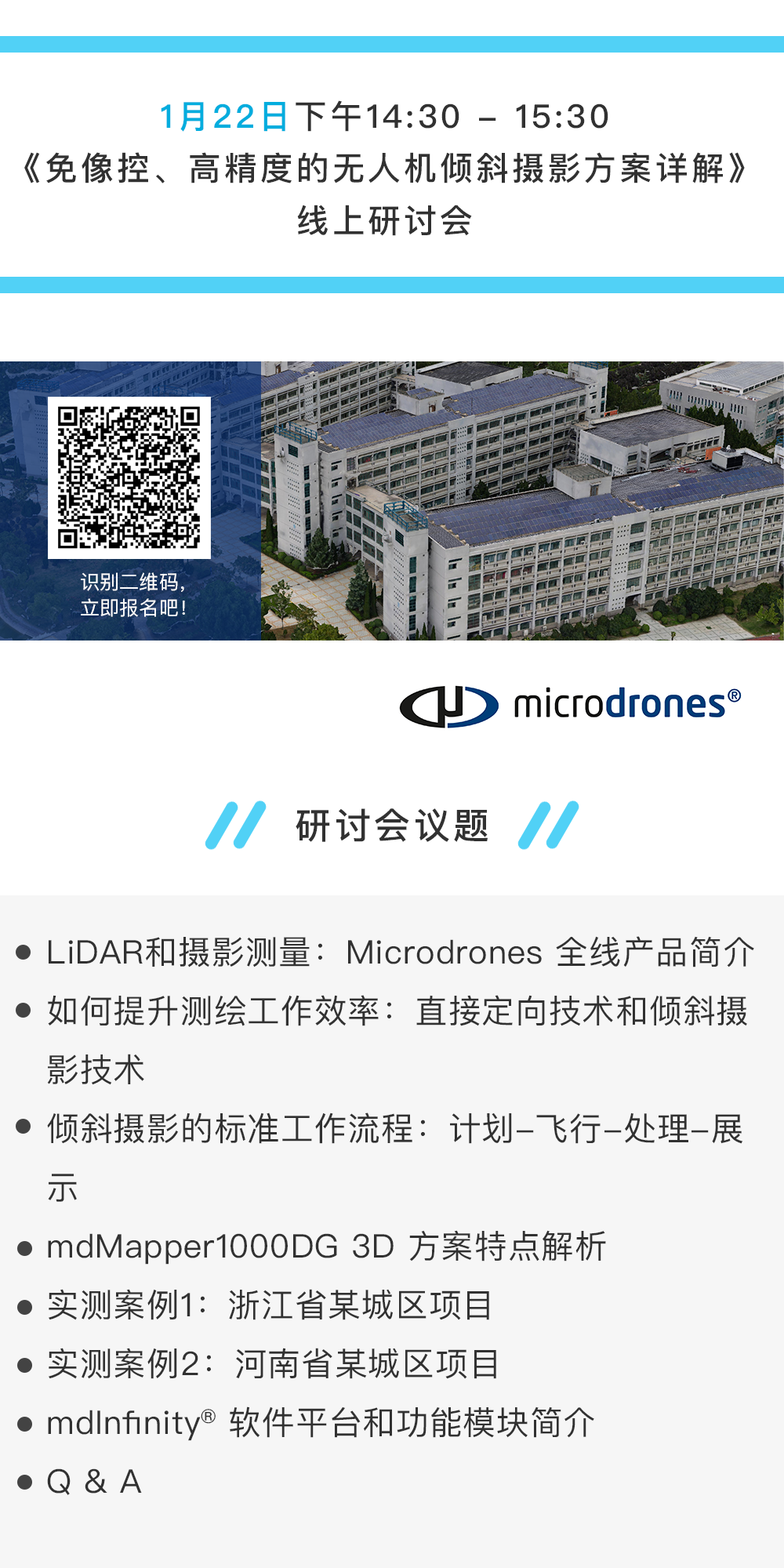 2021年1月22日,Microdrones 将推出《免像控、高精度的无人机倾斜摄影方案详解》线上研讨会,通过技术和方案介绍、实测案例分享等方式探讨如何更有效地收集和使用数据。诚邀您的参与!