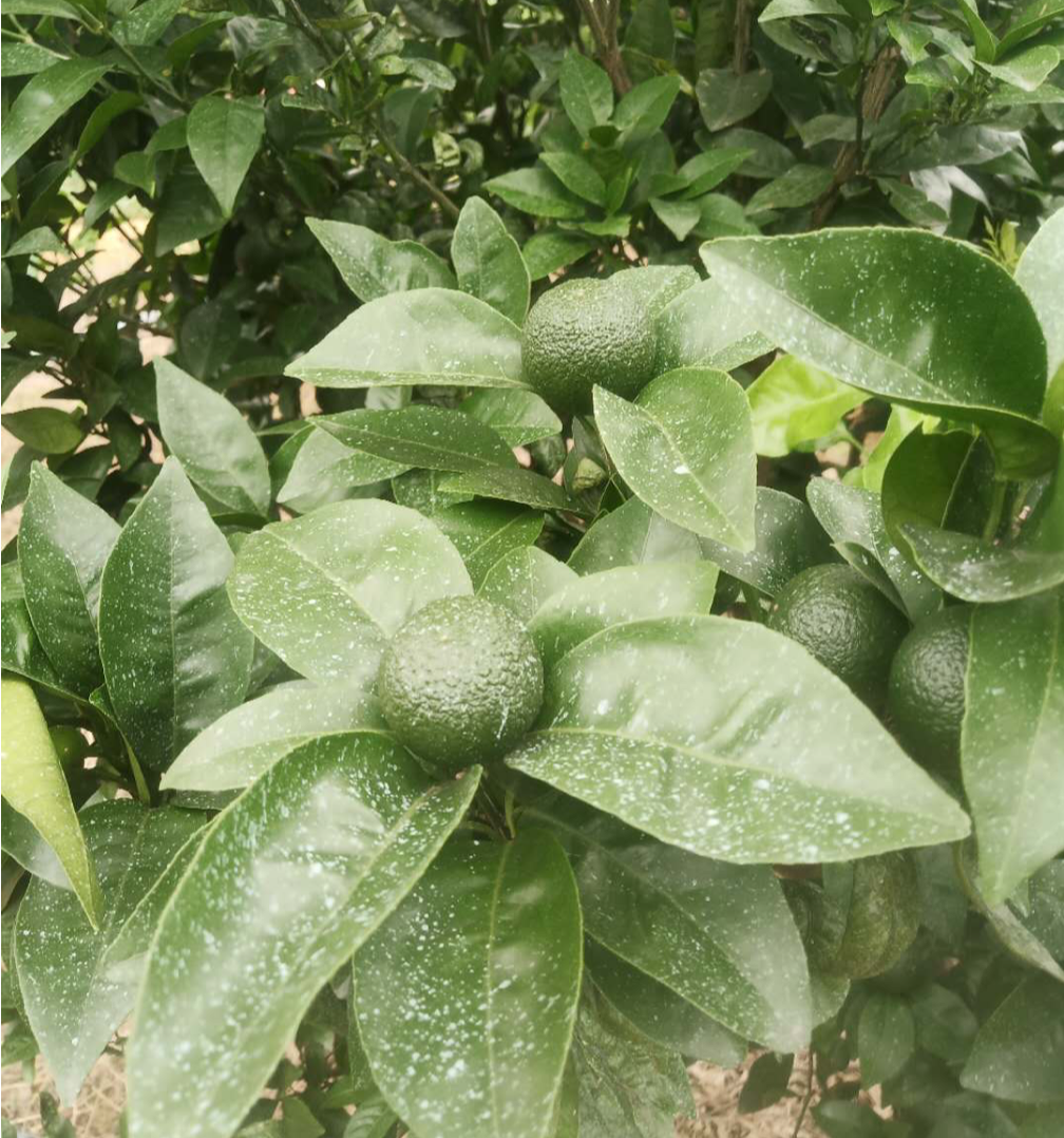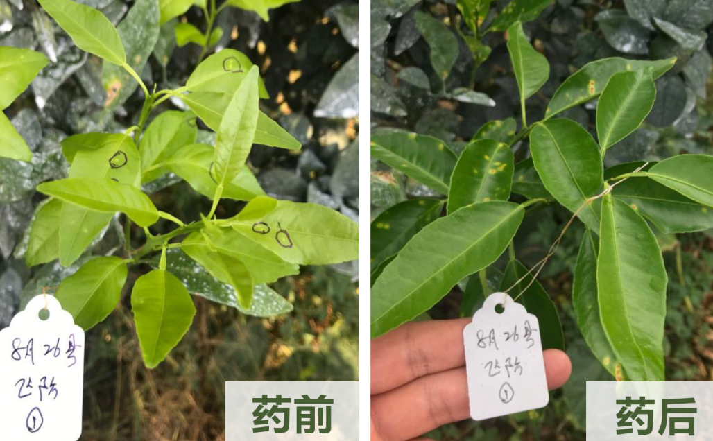 经过施药前后对比,原来嫩叶上出现的溃疡的小白点没有扩散,溃疡病得到了有效控制。