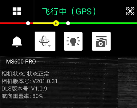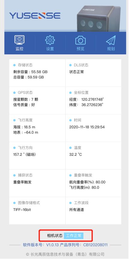 (1)相机上电完成自检后,进入多光谱影像界面,只要显示“状态正常”,则表明可以正常工作,同时DLS与相机均显示绿灯。