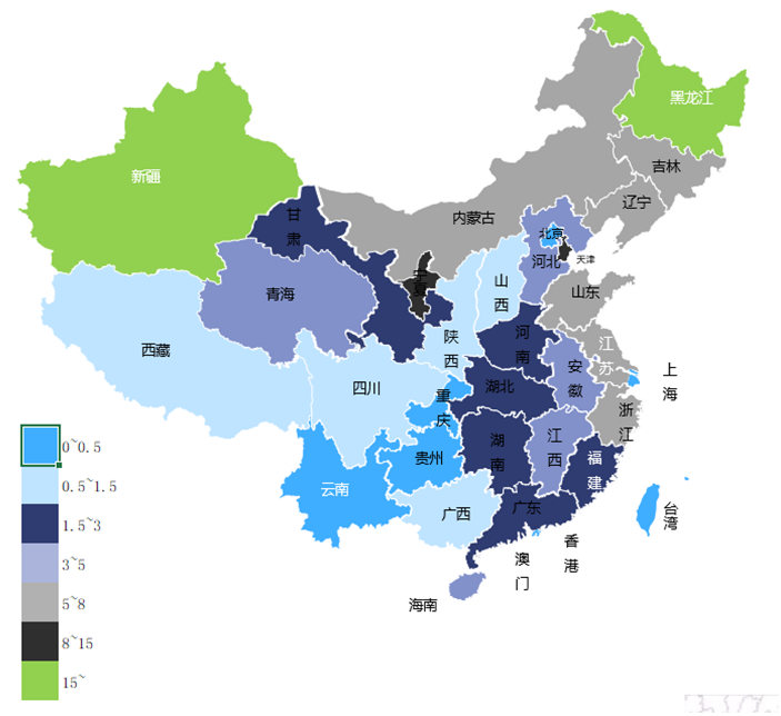 中国地域辽阔,地形、人均面积、作物、耕作制度差异极大,植保无人机是一种高效的植保设备,更平整、更有规模的耕地有利于飞防的开展。全国以黑龙江建三江地区、新疆生产建设兵团地区、江苏农垦地区飞防应用比例最高,处于中等水平是山东、河南、安徽这种人均面积较少,但具有良好地形的区域,云南、贵州、广西因为地形和人均耕地面积等原因,飞防应用水平在全国处于较低水平。