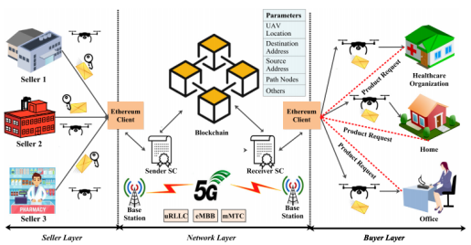 它被分为三层,即(i)卖方层,(ii)网络层和(iii)买方层。买方层通过以太坊客户端通过5G通信信道通过BC网络从卖方层请求产品。买方和卖方层之间的SC在卖方层发起交货之前结算付款。然后,卖家用加密格式的数据(发件人地址、目的地地址、路径节点和UAV实时位置)启动产品交付。然后,再次执行SC,并验证买方和卖方之间所述的条款和条件。数据验证后,详细信息存储在BC网络中。BC网络中的数据非常安全(记录是不可变的),可靠(数据在所有参与节点验证后存储),并且易于跟踪(新的更新被添加到块中)。5G通信信道的加入降低了包裹递送系统的时延。它的uRLLC组件可以将延迟管理到<1ms。