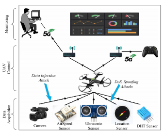 除了5G带来的好处外,它还存在一些尚未解决的缺点(安全和隐私问题)。无人机通信安全攻击的主要目的是控制、窃取其数据,或者在攻击向量中提及其定位传感器,如图1所示。将攻击向量分为三层:(i)数据采集层,(ii)无人机控制层,(iii)监控层。最顶层是数据监控层,它有地面军事系统。它从无人机的传感器获取数据并相应地采取行动。最底层有传感器,包括位置、空速、超声波、摄像头和温度传感器。该层称为数据采集层。中间层称为无人机控制层,它从底层获取数据并转发给地面军事系统,同时执行地面军事系统接收到的指令。最后,这一层还有一个无人机遥控器,在紧急情况下,如自动驾驶仪失灵或环境太复杂,没有经验丰富的飞行员和人类反应无法导航时,这是必要的。这个向量显示了对无人机可能的攻击。5G通信中可能存在的一些高风险攻击包括中间人(MIM)、注入、嗅探、GPS欺骗和拒绝服务,如图1所示。