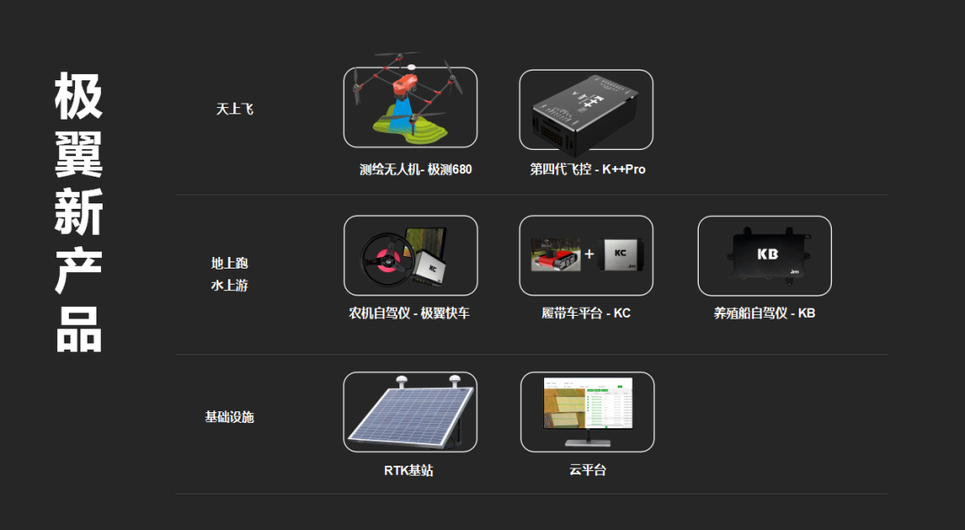 2月2日,极翼围绕“融合上下游,打造全球智慧农业”为主题,在线上面向全球用户举行新品发布会,发布了极测680农业测绘无人机、农机自驾仪、履带车开发平台、养殖无人船自驾仪、RTK基站和第四代农业飞控K++Pro等新品。