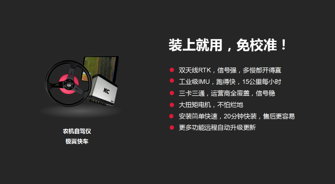 极翼快车农机自驾仪是上海极翼公司自主研发的方向盘式自动驾驶产品。该产品利用卫星定位、惯性导航、直驱电机等技术,使农机按照规划好的路线,自动调整行进方向,作业精度可达±2.5cm,可适用于插秧、开沟、耙地、播种、起垄、施肥、喷药、收获等各种农业作业环节;适配久保田、洋马、沃德、井关、约翰迪尔、凯斯、东方红等90%品牌农机。