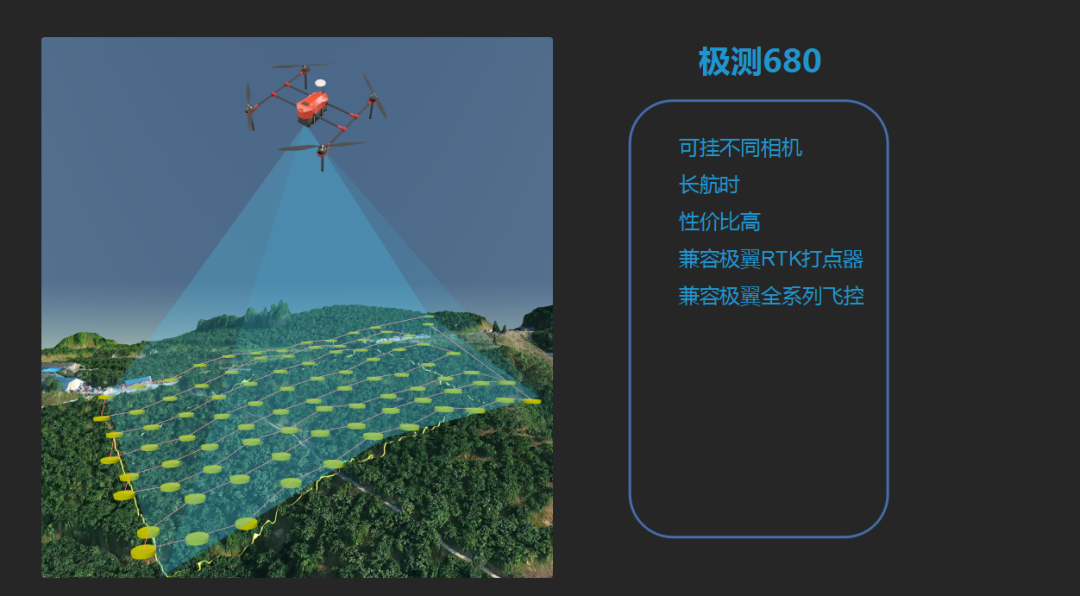 极测680是极翼新发布的农用测绘无人机,通过三维测绘的采集建模,为果树、山地作业等提供更完美的解决方案,提高了无人机作业效率。
