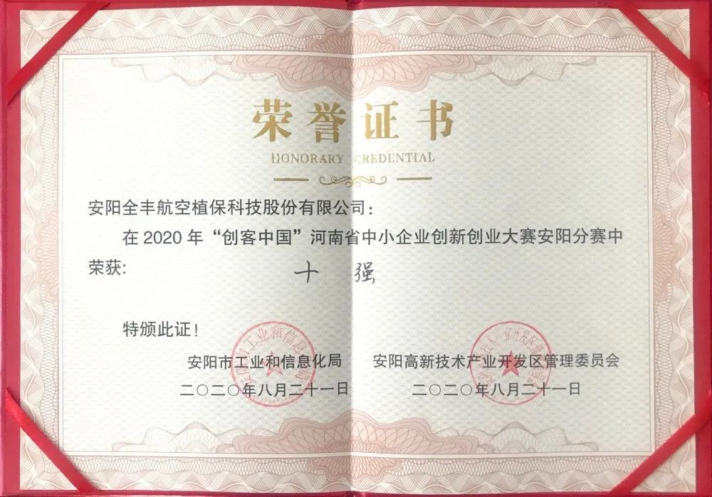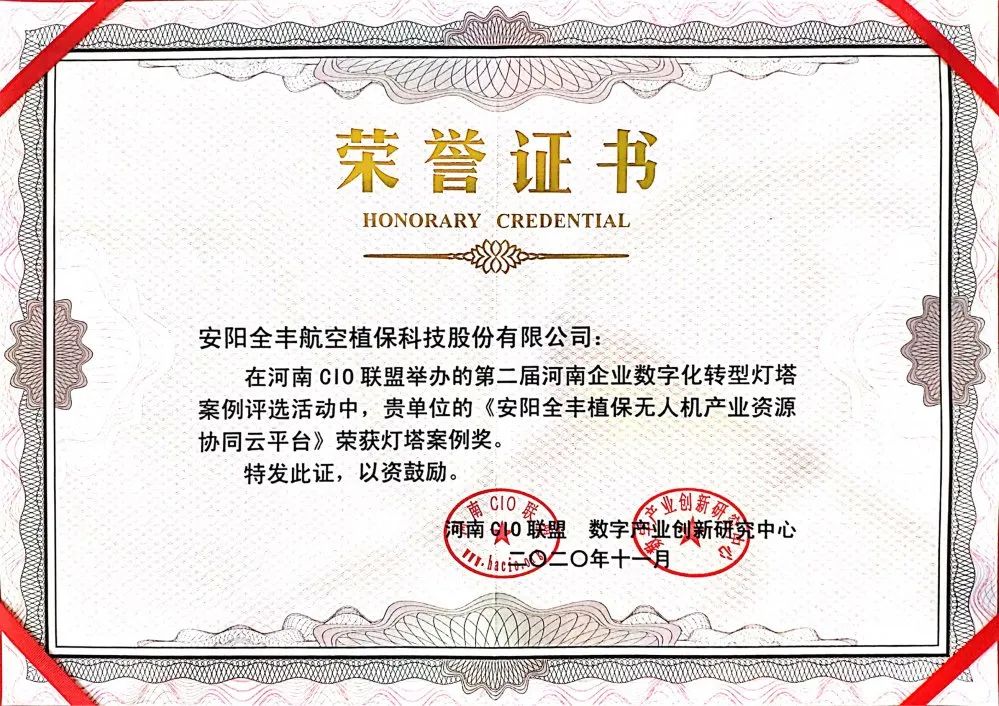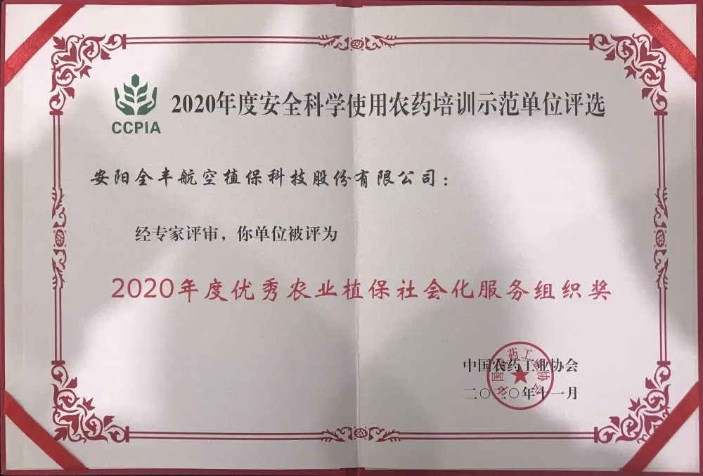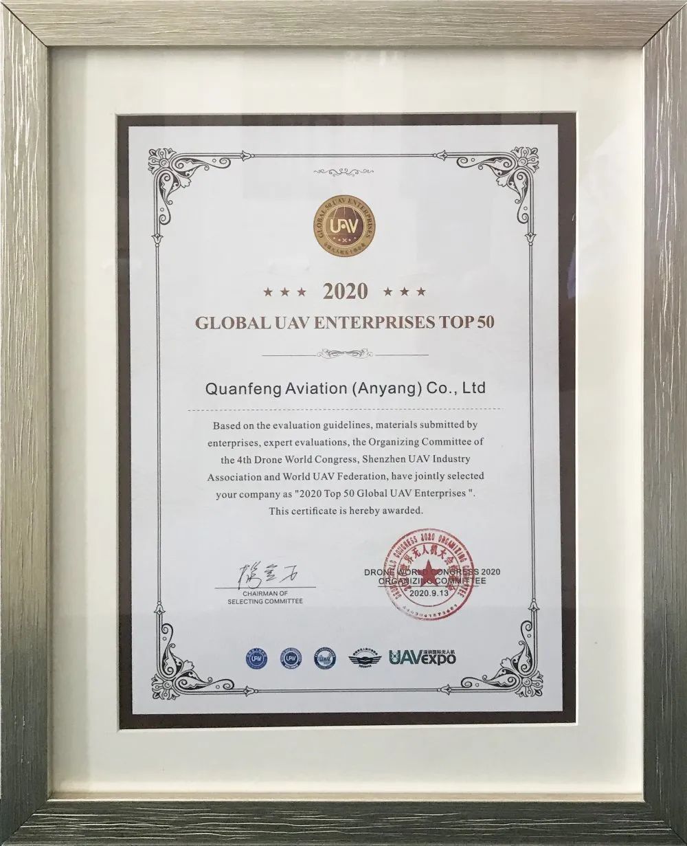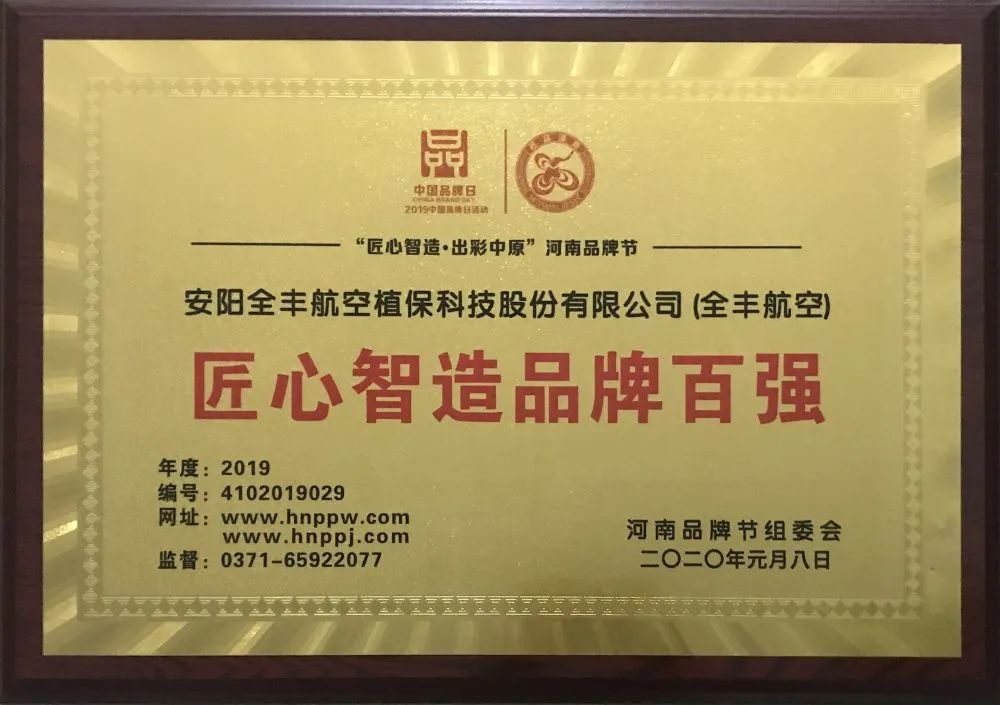 2020年全丰航空荣获了匠心智造品牌百强企业、全国农牧渔业丰收奖一等奖、2020年全球50强无人机企业、2020年优秀农业植保社会化服务组织奖、2020年河南企业数字化转型灯塔案例等荣誉。