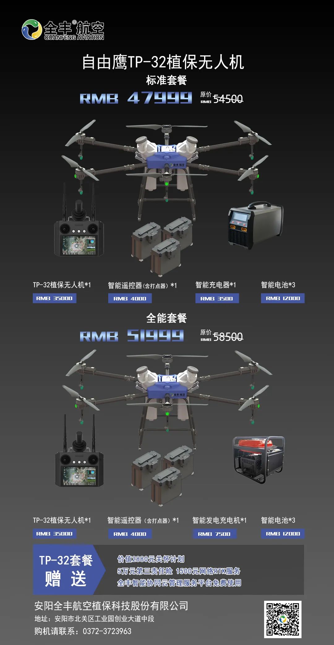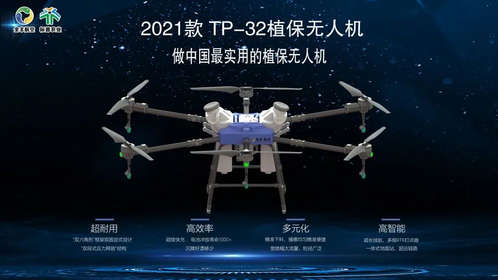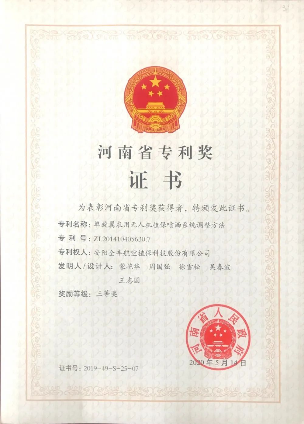 目前安阳全丰航空植保科技股份有限公司已完成了具有自主知识产权的3WQF120-12、3WQF80-10、3WQF125-16、3WQFDX-10及3WQF294-35型多款农用无人机机型的研发、生产与推广。全丰农用无人机已获得国家科技部成果鉴定及农用无人机国家专利数十项。