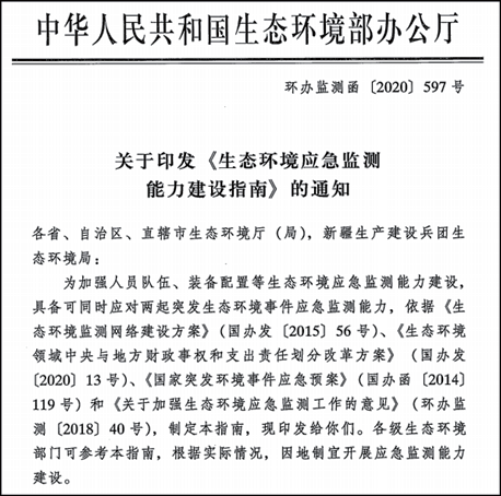 2020年中华人民共和国生态环境部办公厅发布<关于印发《生态环境应急监测能力建设指南》的通知>,为各级生态环境部门作为指导参考。