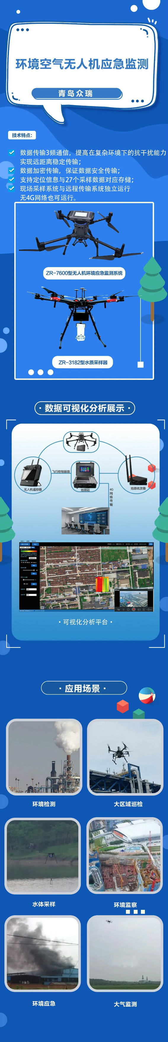 青岛众瑞经过多年技术开发,成功研发出两款无人机应急监测设备——ZR-7600型无人机环境应急监测系统、ZR-3182型水质采样器