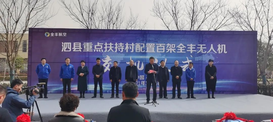 2021年3月16日,安徽全丰航空植保科技有限公司与泗县重点扶持村配置百架植保无人机交机仪式隆重举行,会议在安阳全丰制剂分公司吴一汉经理主持下拉开帷幕。泗县人大常委会副主任胡浪涛、泗县农业机械化管理服务中心主任王涛、泗县农业机械化管理服务中心四级调研员、县农机装备产业园办公室主任孙茂勇、泗县农业农村局副局长苏明、泗县村集体经济改革发展领导办公室副主任张群、泗县农技推广中心主任许云昊、安徽全丰航空植保科技有限公司总经理王天勇、河南标普农业科技有限公司市场总监付小键、安徽全丰技术顾问、泗县标普农业科技有限公司总经理赵秀英、淮北标普农业科技有限公司总经理刘璐等领导参加本次交机仪式。