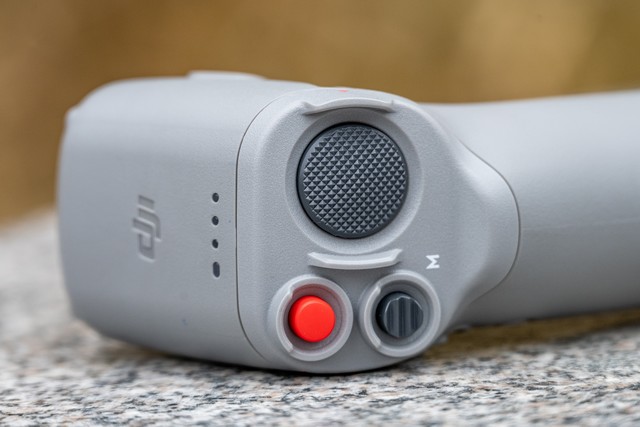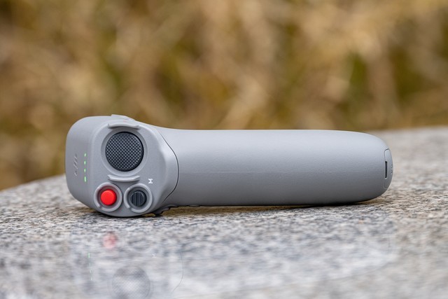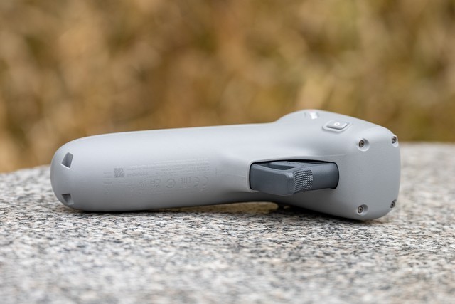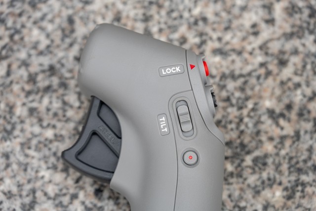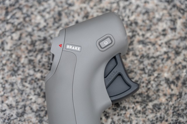 还是重点,我们现在来介绍穿越摇杆。这是伴随DJI FPV无人机一起的新产品,它设计风格很简单,就像是游戏机的简易摇杆,但是实则是一款支持体感操作来控制飞行的摇杆。摇杆背面的扳手就是油门,阻尼设计优秀所以体验很出色。摇杆的侧面有摄像头俯仰调节的拨杆和拍摄按钮、开关按钮。
