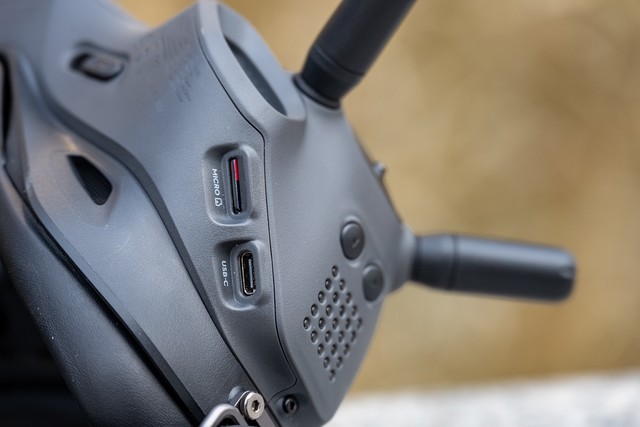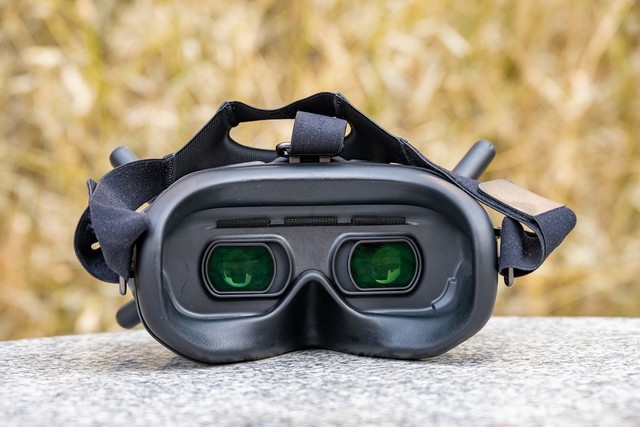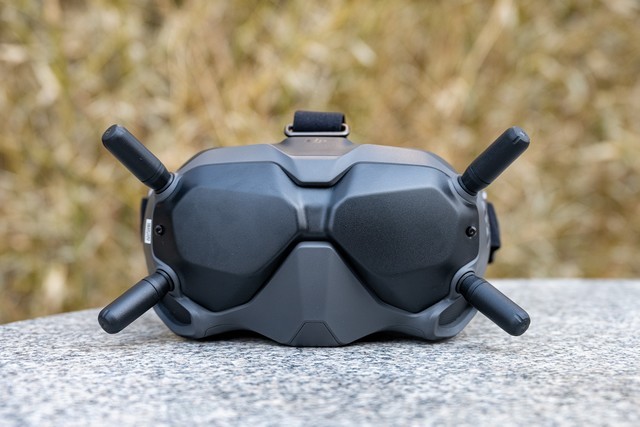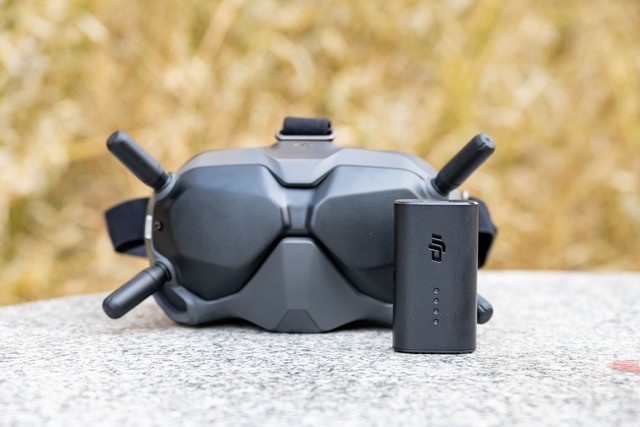 飞行眼镜V2支持在眼镜上录制飞行画面,保证素材同步备份,避免出现无人机坠落无法找回等情况下视频素材的丢失。飞行眼镜V2需要使用手机通过USB-C接口连接进行数据同步以及固件更新。飞行眼镜V2使用时需要通过USB-C连接外置电池使用,内部并没有内置电池,因为这样可以保证轻便的佩戴重量。不过需要提醒大家的是,如果使用者佩戴尺寸较大的眼镜,佩戴飞行眼镜V2时会比较麻烦,希望大疆在后续可以进行改进优化,为佩戴近视眼镜的使用者进行更好的设计。