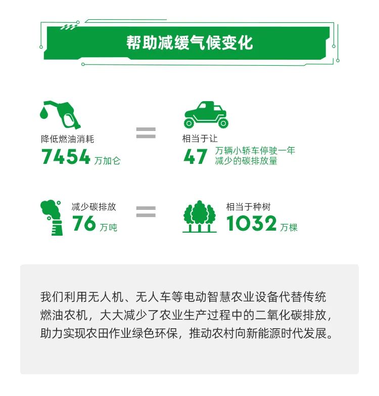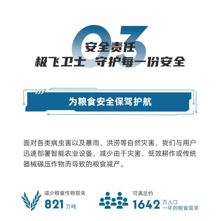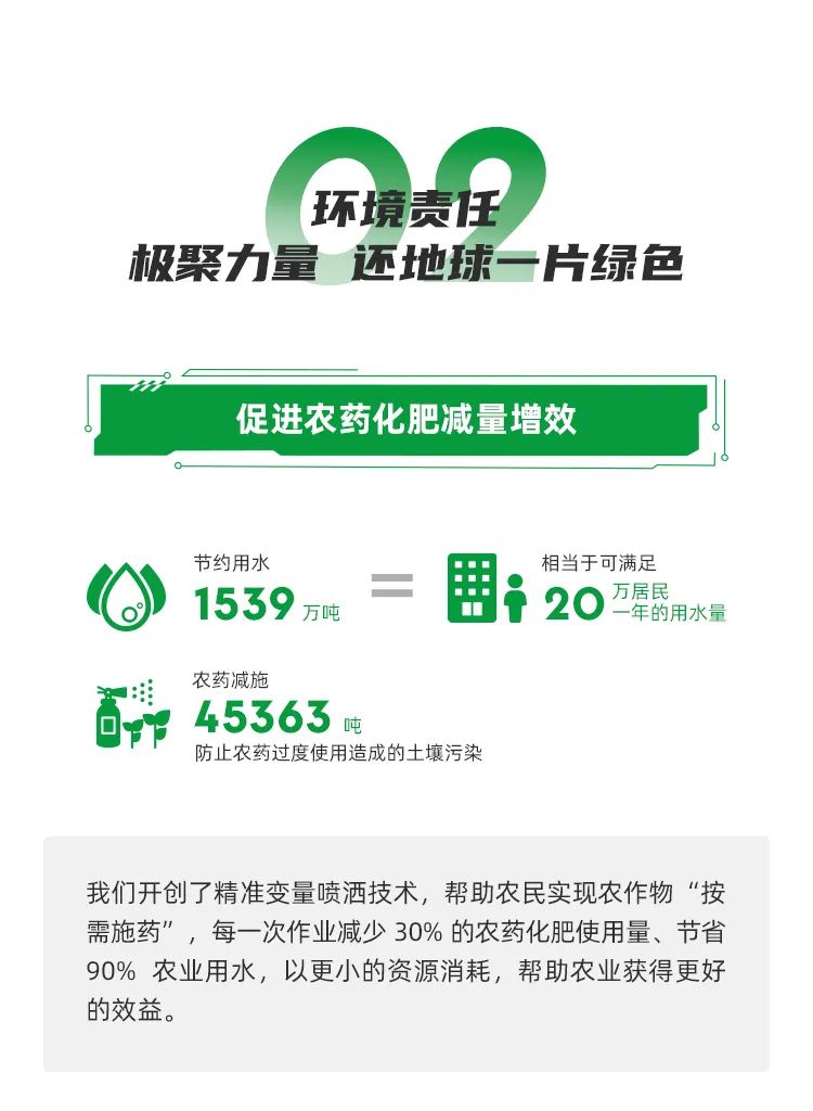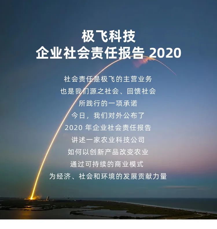 极飞人相信,科技是最大的公益。用技术赋能农业,既是主营业务,也是极飞社会责任。截至 2020 年 12 月 31 日,极飞的产品和服务累计为农户减少粮食损失约 821 万吨,减少农药使用超过 4.5 万吨,节水 1500 余万吨,减少农业生产碳排放 76 万吨。极飞科技也因此成为首家荣获农业科技界奥斯卡“最佳精准农业技术创新奖”的中国科技公司,首个荣膺路透社“全球商业责任大奖”的中国企业,并于 2020 年入选中国“十大智慧农业新技术应用模式”和联合国“十大数字农业与人工智能应用案例”。