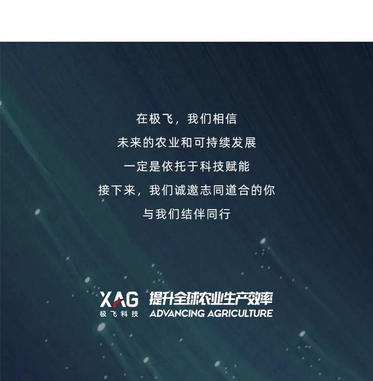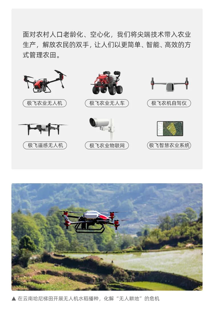 极飞的愿景是,构建一个满足人类未来 100 年发展需求的农业生态系统,让全世界的人们都能获得充足、丰富和安全的食物。成立 14 年来,极飞自主研发了农业无人机、农业无人车、农机自驾仪、农业物联网和智慧农业管理系统等产品。通过构建完善的渠道体系,为农户提供智能、高效、经济的生产工具和数据服务;帮助农场解决劳动力成本高、生产管理粗放等问题。