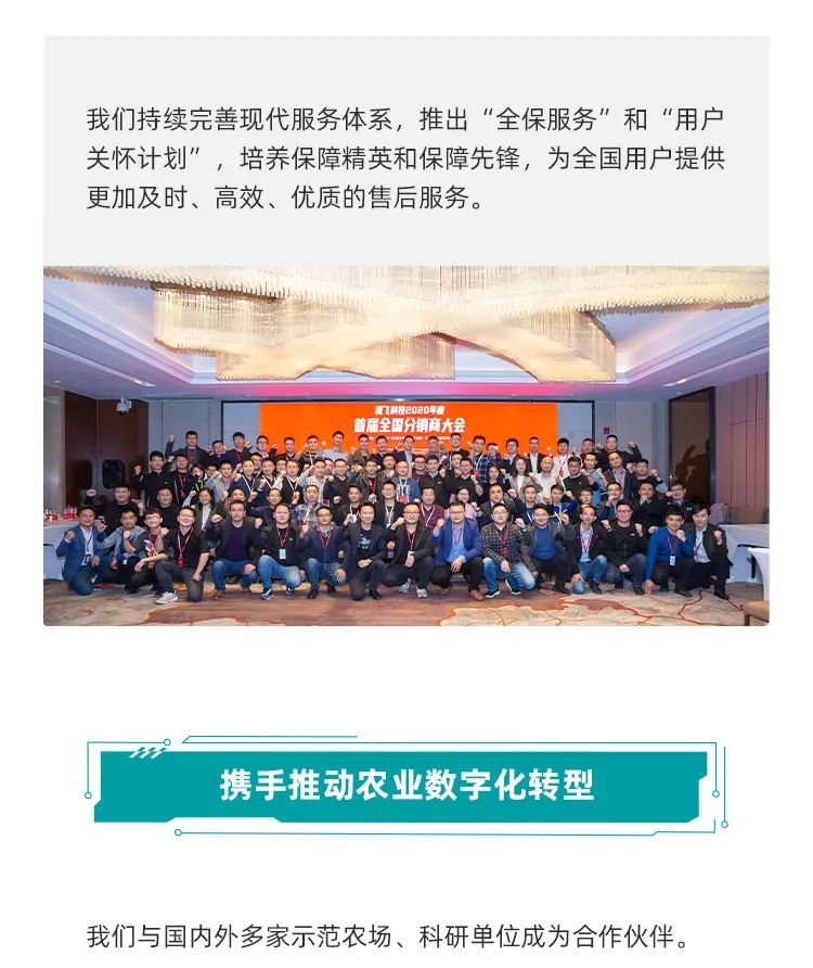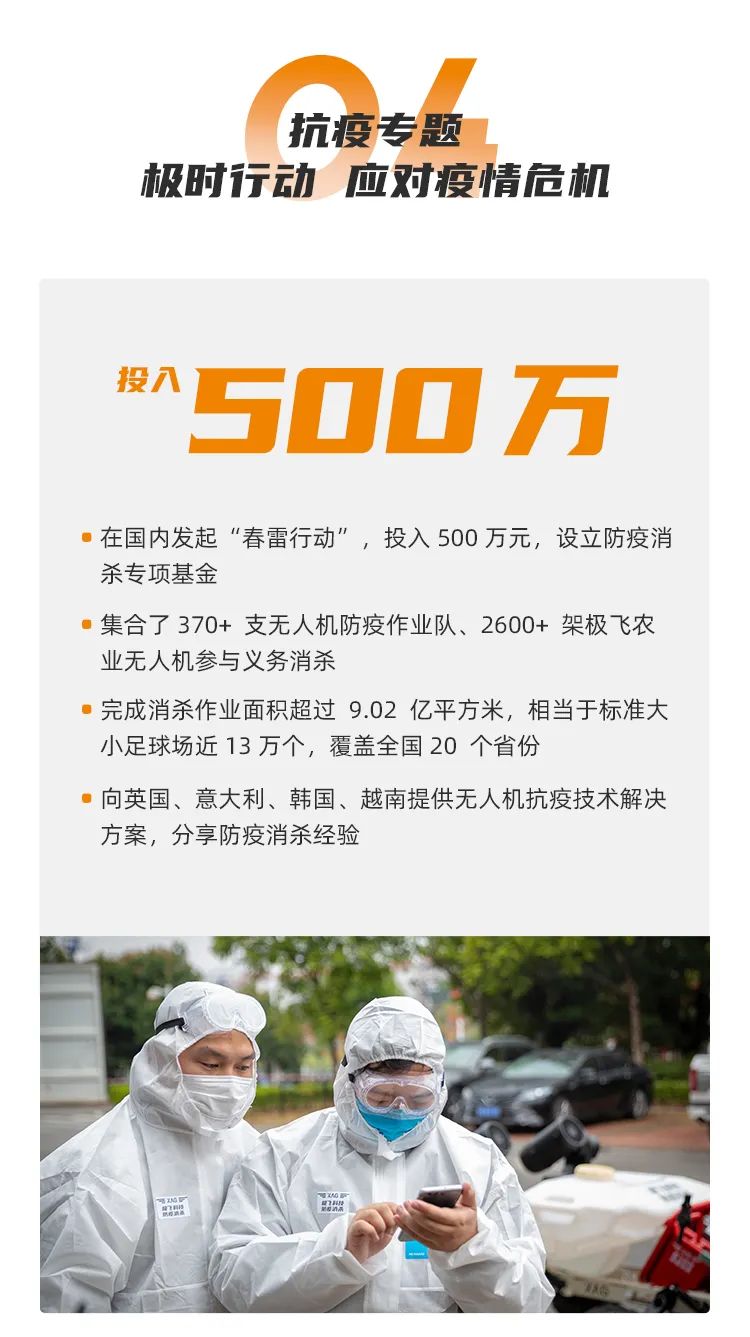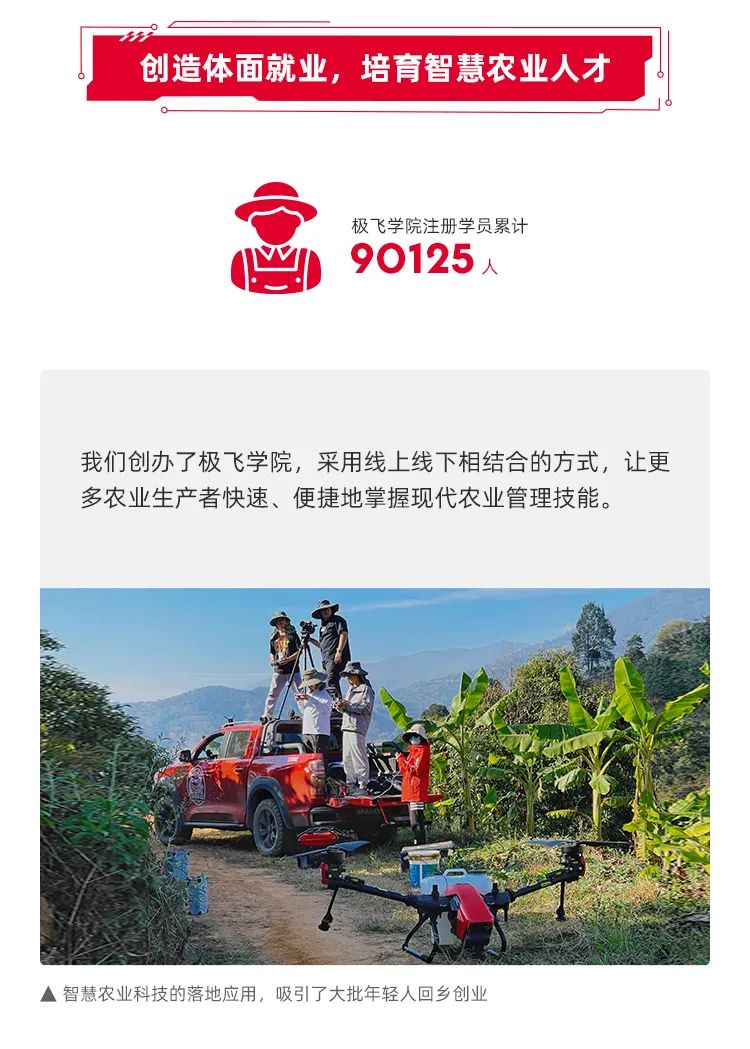 截至 2020 年 12 月 31 日,极飞服务了超过 931 万农户、7.8 亿亩次农田,服务网络覆盖了 42 个国家和地区,同时通过线上知识服务和线下培训业务,培养了超过 9 万名智慧农业从业者,为全球农业的升级转型奠定人才基础。