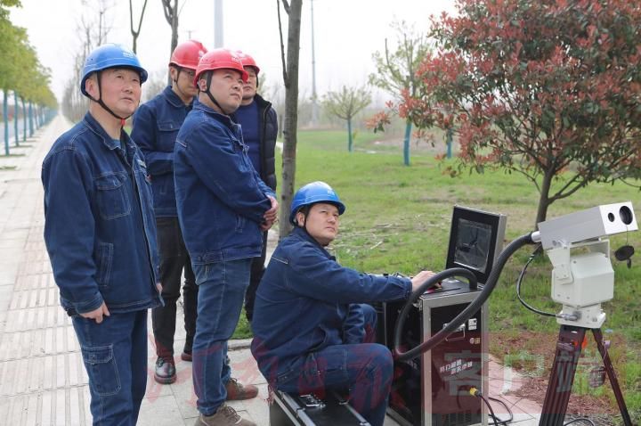 淮滨县供电公司输电运维人员立即报告,请求上级“火力支援”。信阳供电公司接报后立即启动市县输电协作救援机制,火速派来输电专业人员,指导协助他们首次采用高压输电线除障“神器”——激光炮远程除障。