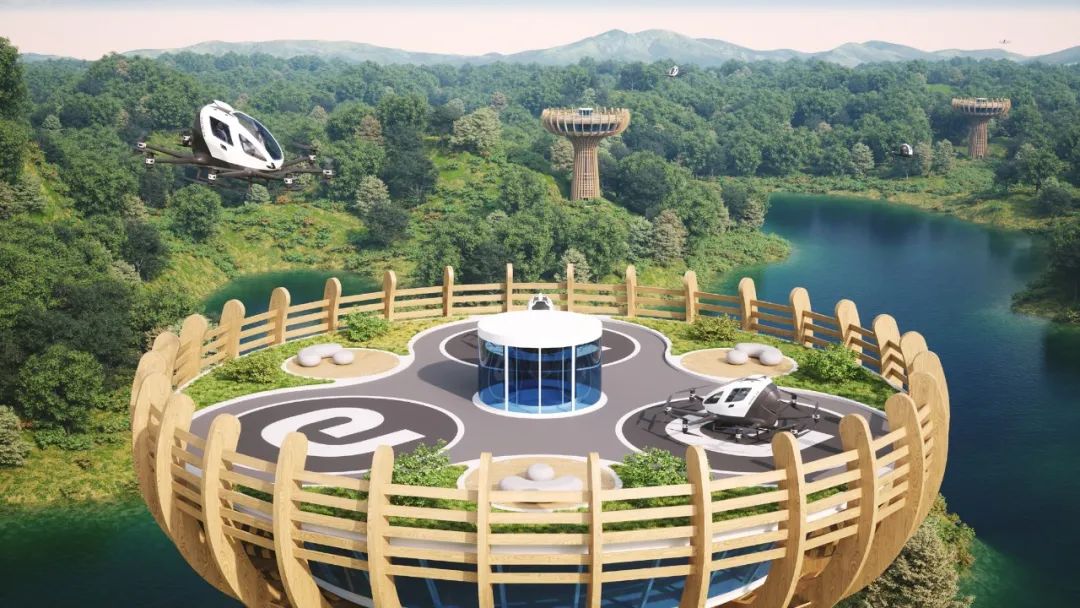GZDG设计该航站楼的灵感来自于非洲树种猴面包树,基于这一天然的建筑造型,航站楼将包含一座30米高的钢结构和叠层木结构的塔楼、候机室、咖啡厅、200平方米的全景餐厅和接驳电梯。自动驾驶飞行器的起降机场将被设置在航站楼的顶层平台上。以可持续发展为核心设计理念,航站楼将使用绿色能源,其防滑光伏板每天可产生超过300度电的电能。该平台将提供完全独立的即插即用充电基础设施,可用于给亿航智能自动驾驶飞行器充电。以“猴面包树”航站楼为起点,亿航智能和GZDG致力于共同探索新兴的全球生态旅游领域,有望在欧洲和东南亚等多个地区启动相关项目。