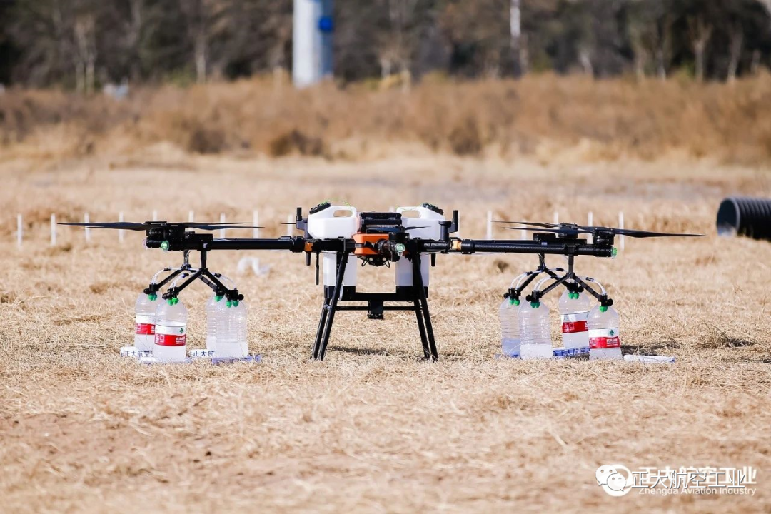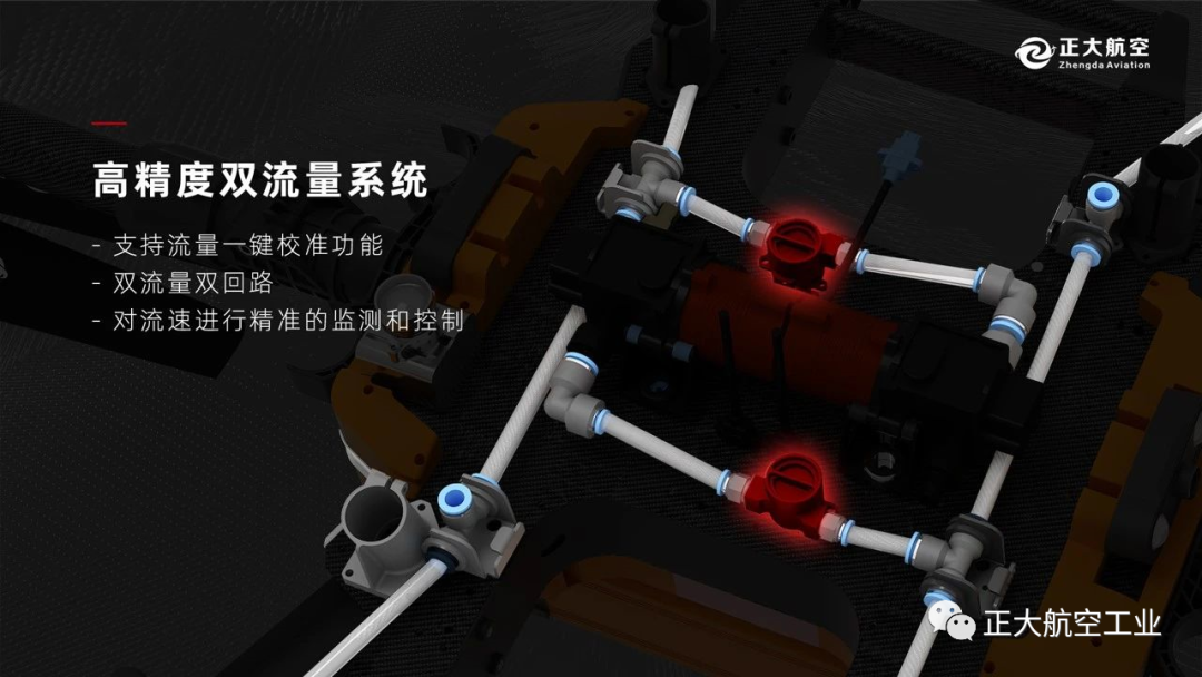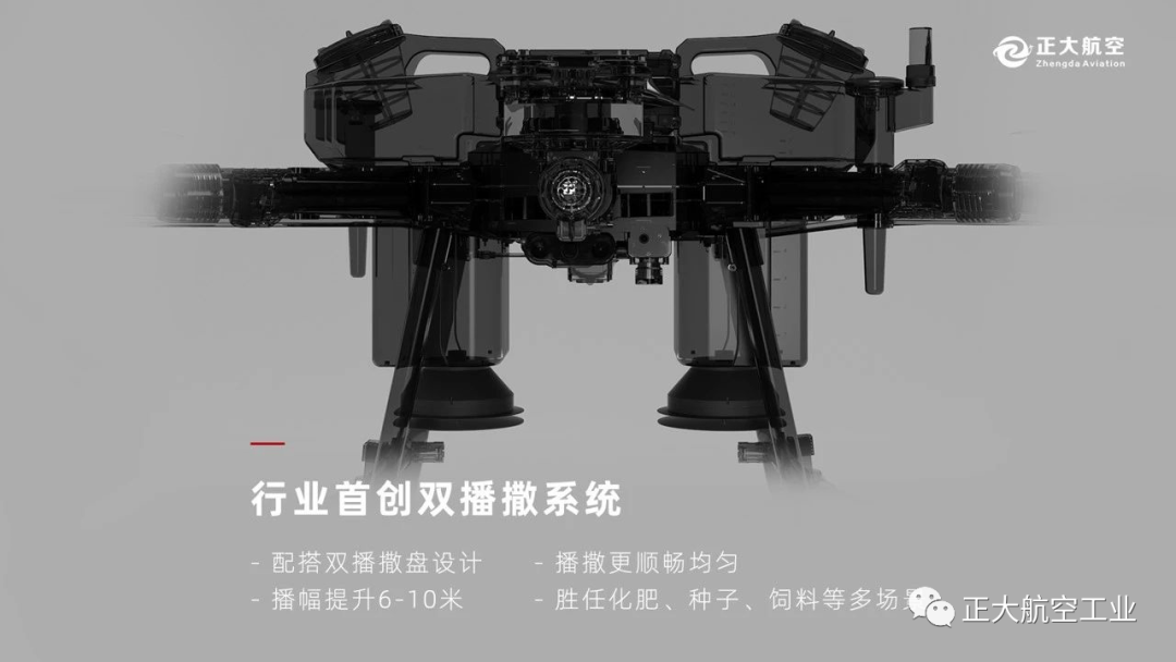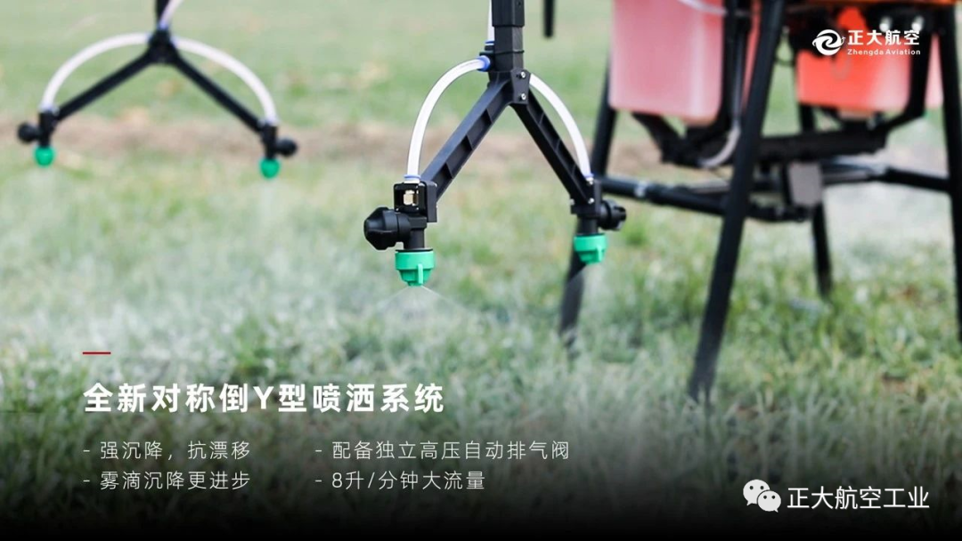 F60的喷洒系统为对称倒Y型喷洒系统,可实现8L/分钟的最大喷洒流量,配备的独立高压自动排气阀,使得药滴喷洒更加均匀。正大航空还配备了双播撒系统,可以播撒化肥、种子、饲料等多种固体颗粒。
