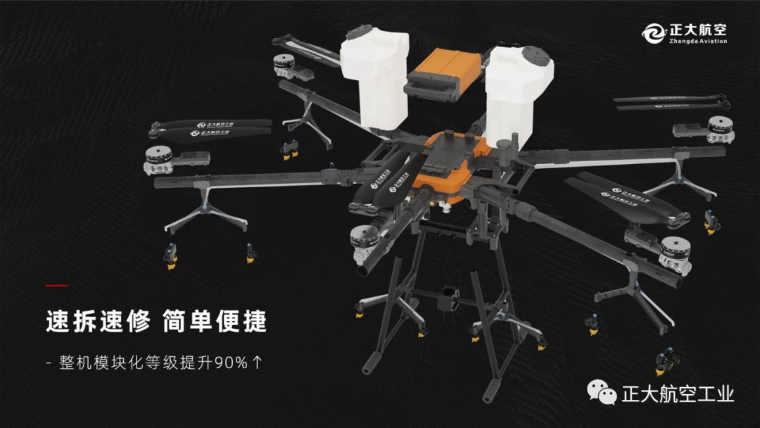 正大航空旗舰机型F60农业无人机,采用了斜向环抱式结构,折叠后体积大幅缩小,便于用户转场运输。整机采用的是IPX7的防护等级,一体注塑成型机臂和吸能框架结构使得机身强度提升了38%。整机的模块化等级提升90%。F60采用的是正大航空首创的双药箱设计,电池位于药箱中间机身上部,45°插播专利使得用户拆装更加方便。F60采用了36寸的航空折叠桨,最大拉力可达26.6Kg。