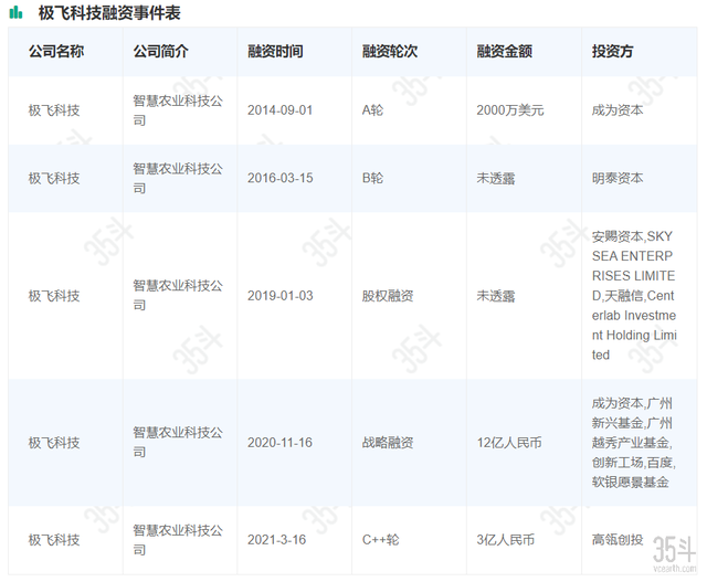 2020年11月,极飞科技获得由百度资本和软银愿景基金二期领投,创新工场、越秀产业基金和广州新兴基跟投的12亿元人民币融资,成为迄今中国农业科技领域最大的笔商业融资。