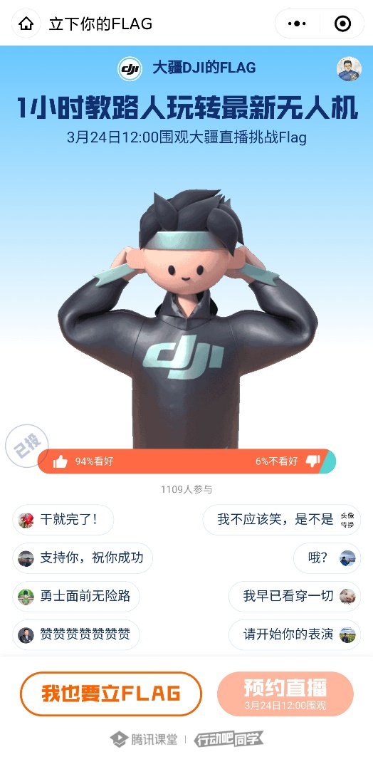 在3月16日-31日,腾讯课堂举办的“立下我的flag”活动期间,大疆受邀立下了 “1小时教路人玩转新无人机”的flag。在24号的大疆X腾讯课堂直播首秀中兑现诺言,完成了一小时教零基础路人上手DJI FPV无人机的挑战。直播中,不仅有两位被选中的路人幸运儿完成了自己人生中的第一次无人机飞行,屏幕外的观众也通过观众模式,实时观看到DJI FPV的图传画面,收获了全新的沉浸式飞行体验。同时幸运儿还体验了零基础快速上手编队飞行无人机,抢先体验了即将发布的RoboMaster TT编队飞行套装。