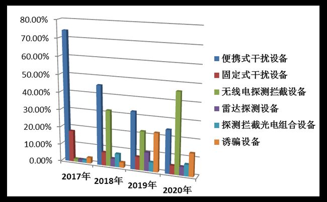 2017年,无人机反制系统检测的产品主要以手持式无人机干扰拦截设备为主,同年年底出现带无人机频谱探测功能的反制设备和雷达设备。2018年,无人机探测拦截设备增多,基于TDOA技术的探测拦截设备正式出现;同时期,作为主流技术的AOA设备大量应用,由频谱探测、光学探测以及固定式拦截设备组成的无人机侦测防御系统出现;同年年底,以协议破解为技术的无人机探测设备出现,它可以进行多目标拦截。2019年,探测雷达的性能提高,其探测距离和精度都有相应提升;诱骗设备方面,全向情况下的作用距离增加,发射功率更低,并具备无人值守功能。