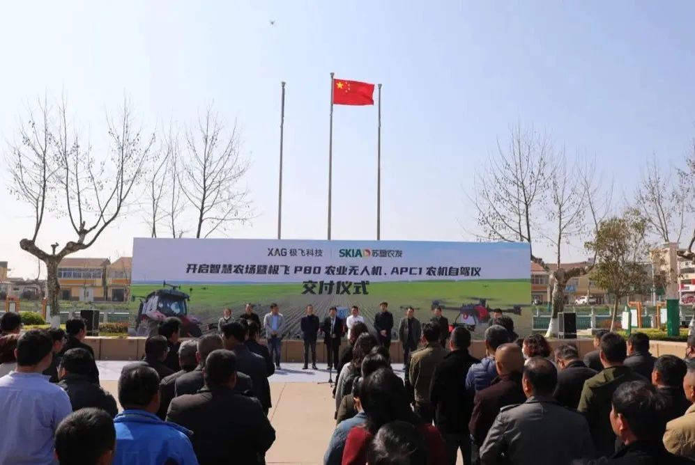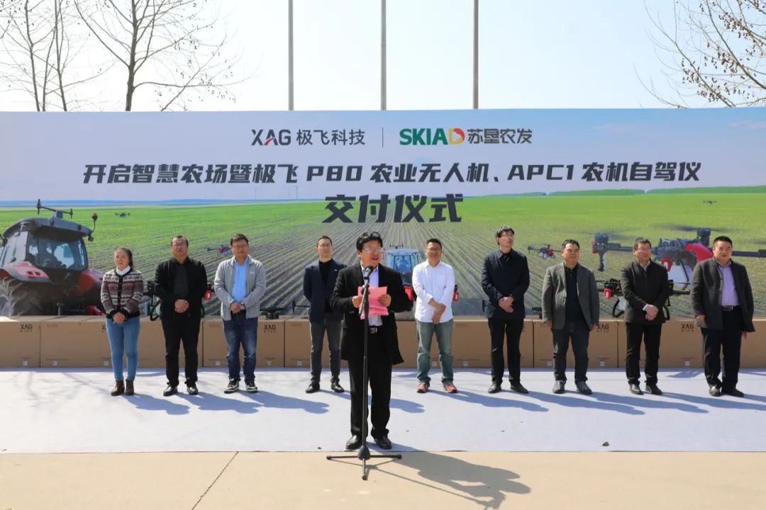 3 月 26 日,极飞科技联合苏垦农发临海分公司启动智慧农场暨极飞 P80 农业无人机、 APC1 农机自驾仪交付仪式。极飞科技高级副总裁徐连云,江苏省农垦农业发展股份有限公司临海分公司总经理黄礼庆,极飞科技渠道二部总经理姚成、极飞科技农机智能化部总经理单苏干等出席活动,共同探讨智慧农业的实践方案与未来发展趋势。