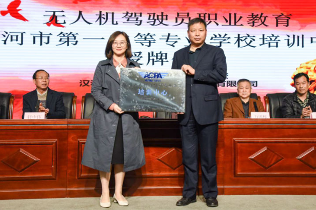 在热烈的掌声中,周风景院长向芮耀民校长为无人机驾驶员职业教育培训中心授牌。