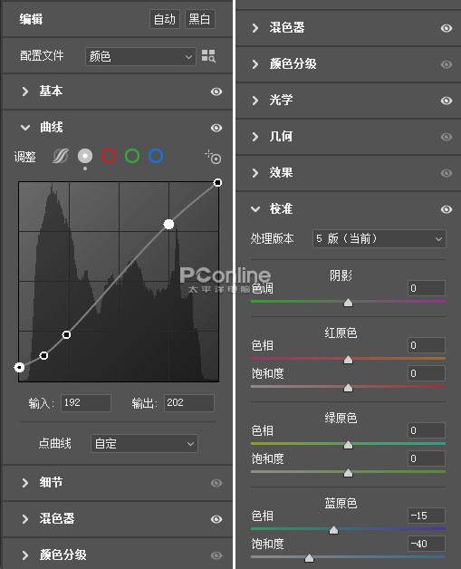 接下来进行局部色彩微调,我们为了稍稍增强对比,先拉出一个轻微的S曲线。并且在颜色校准里,把蓝原色和饱和度偏左。