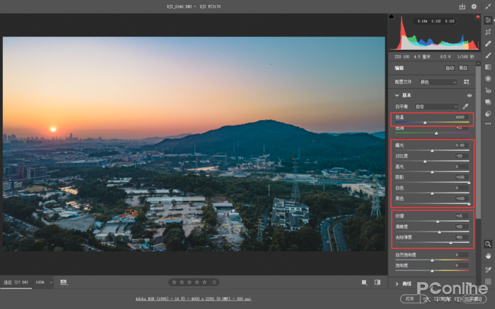 日落场景里,白平衡默认已经有5800,可以再偏暖一些,我调到6000。本身影片要保证高光,所以暗部的阴影和黑色只能+100拉回来。高光和白色不动,纹理清晰度可以增加,最重要的去除薄雾一定要增加。