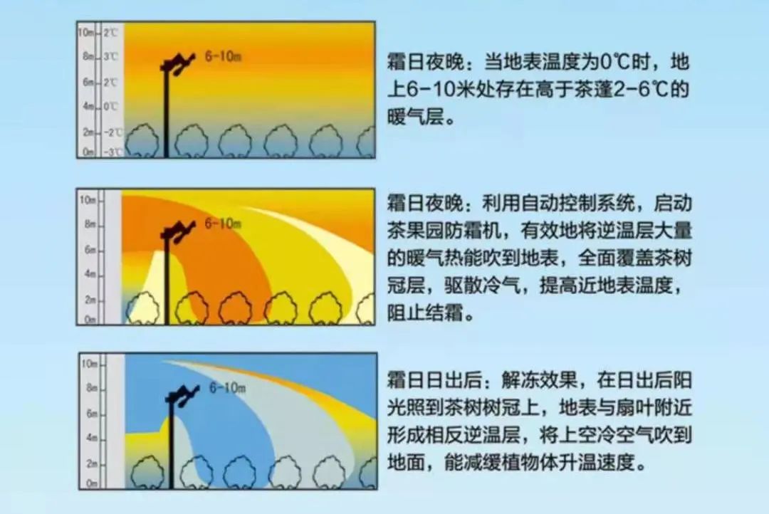 日本早在1928年就开始用电机带动较大的风扇进行茶园防霜研究。一般情况下,温度随着高度上升而下降,但在早春“倒春寒”霜冻发生时,在一定的高度范围内,温度却随着高度上升而增高,这叫“逆温现象”。在逆温条件下,离地面6~10m以上高度空气温度比地面温度高出2~6℃。防霜机就是在霜冻可能发生时,利用特制大风扇将上方较高温度的空气不断吹送至下方茶棚低温域,提高地面温度,避免茶树温度降至0℃以下,从而防止霜冻的发生。