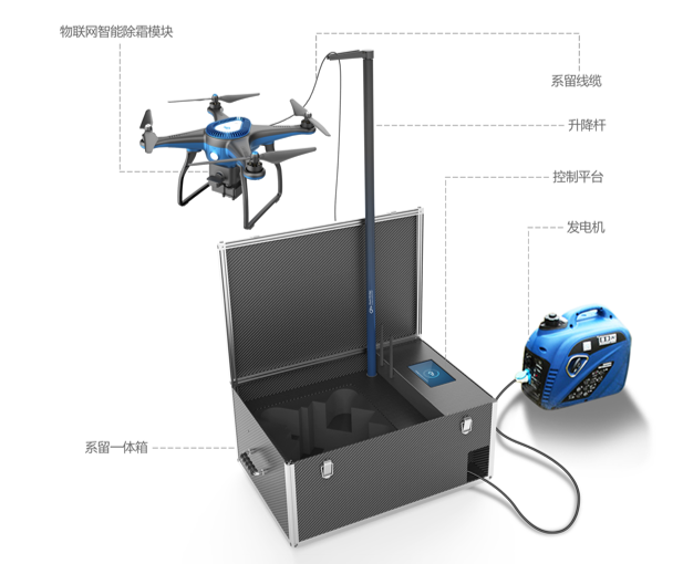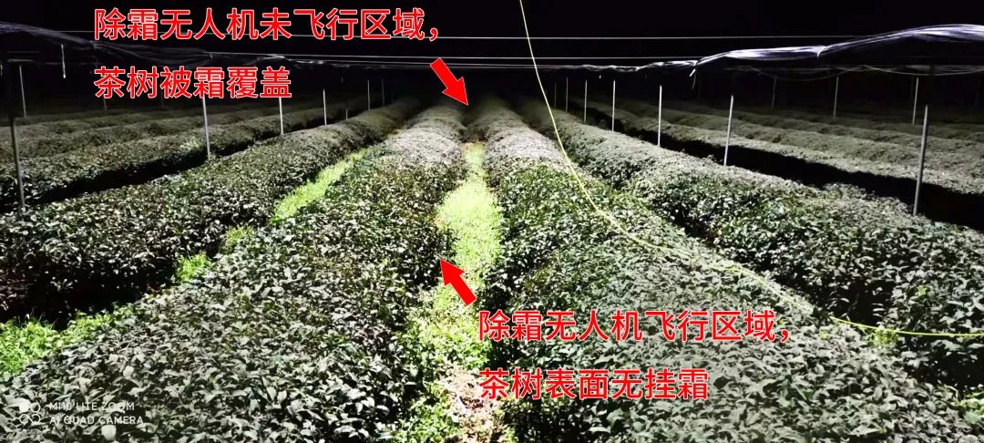 极客桥结合其系留无人机平台的优势,研发了智能防霜模块。将无人机按预先设定的轨迹自动巡航,利用早春“倒春寒”霜冻发生时,在一定的高度范围内,温度却随着高度的上升而增的“逆温现象”,将这个高度上高于地面2-6℃的空气不断吹送至下方茶棚低温域,使上下空气混合增温,以提高地面温度,避免茶树体温度降至0℃以下,防止霜冻发生。